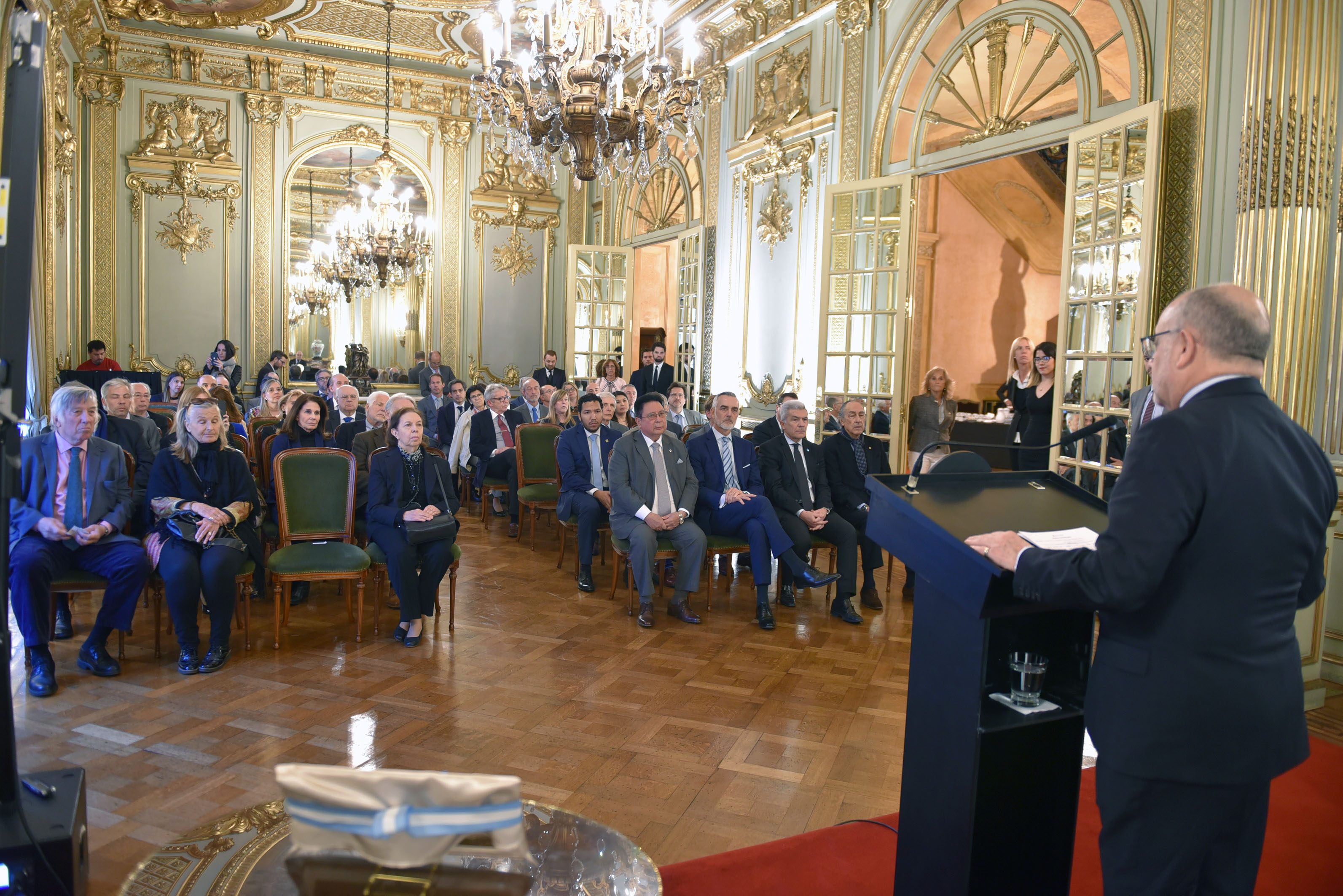 “Desde este momento, este salón, que hemos conocido históricamente como ‘Salón Dorado’, pasara a ser conocido ‘Salón Carlos Saavedra Lamas’. En este lugar, en 1938, se firmó la paz de la Guerra del Chaco y ahora tiene el nombre del artífice de esa paz, que dura hasta el día hoy”, afirmó Faurie.