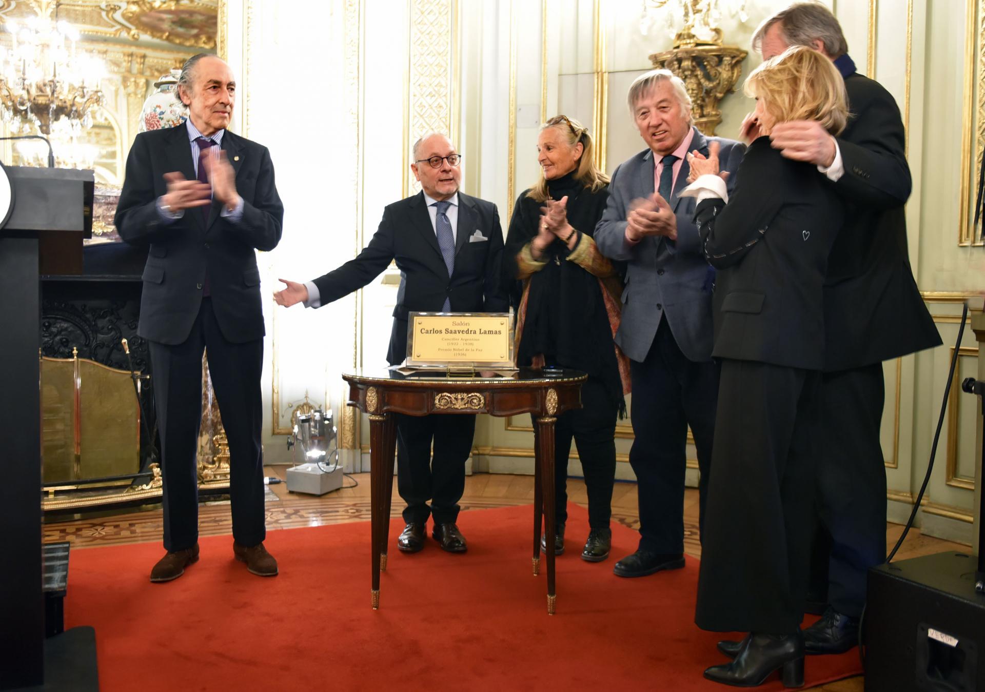 El canciller Jorge Faurie presidió esta tarde la ceremonia de homenaje al ex Ministro de Relaciones Exteriores y Premio Nobel de la Paz, Carlos Saavedra Lamas y descubrió una placa recordatoria con su nombre, que a partir de ahora será también el nombre de unos de los salones más importantes del Palacio San Martín, sede de la Cancillería argentina.