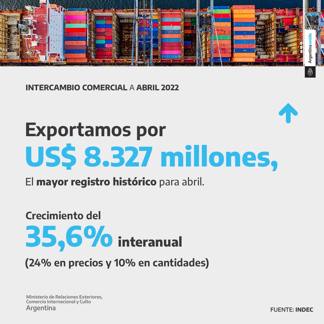 Las exportaciones argentinas totalizaron en abril US$ 8.327 millones, con un crecimiento interanual del 35,6%, que fue impulsado por un aumento de 23,7% en precios y 9,6% en cantidades. El valor exportado de abril representa el mayor registro histórico para este mes en la historia.