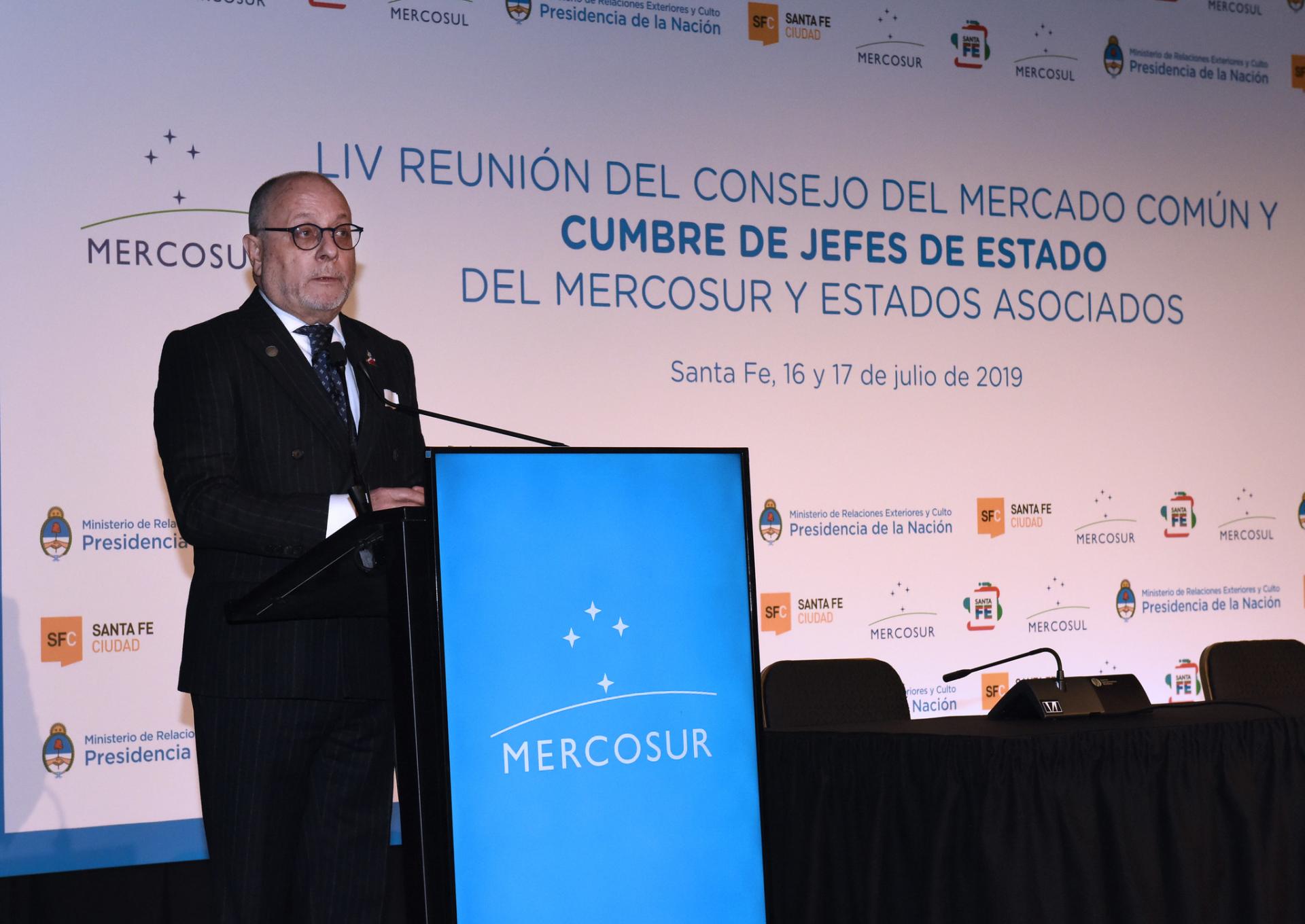 El canciller Jorge Faurie ofreció esta tarde una conferencia de prensa en el Centro de Prensa de la Cumbre del Mercosur que se realiza en la ciudad de Santa Fe y que mañana recibirá a los jefes de Estado del bloque regional.
