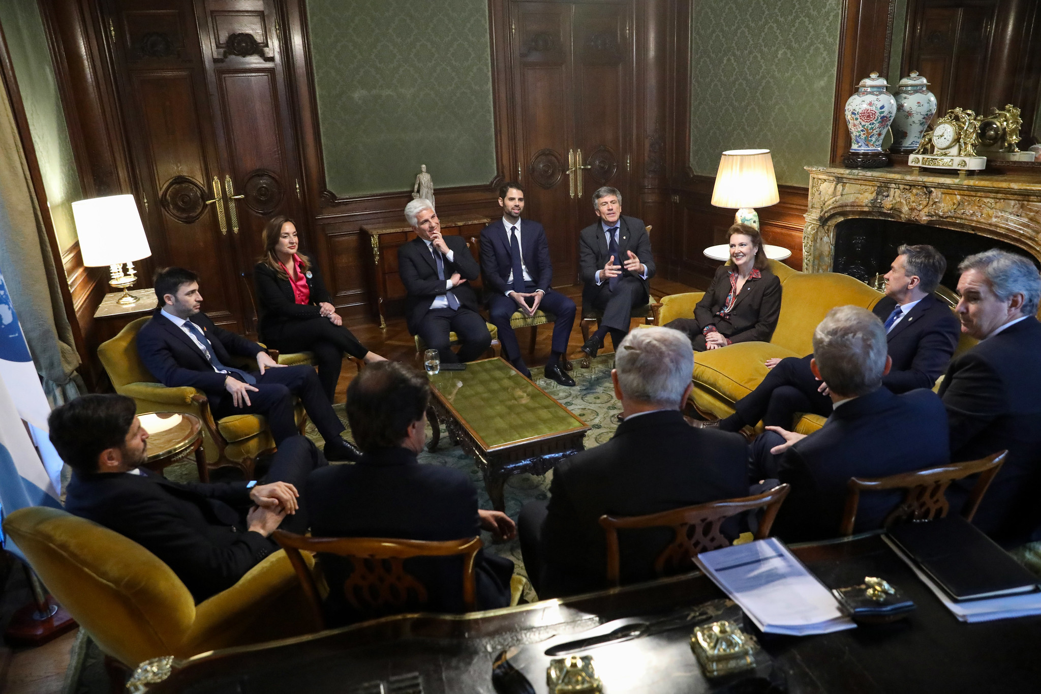 La Canciller Diana Mondino y el Secretario General de la Organización para la Cooperación y el Desarrollo Económicos (OCDE), Mathias Cormann, quien se encuentra de visita oficial en nuestro país, presidieron hoy en el Palacio San Martín un almuerzo de trabajo con Gobernadores de provincias argentinas, con el objetivo de federalizar la información acerca del proceso de accesión de nuestro país a la OCDE.