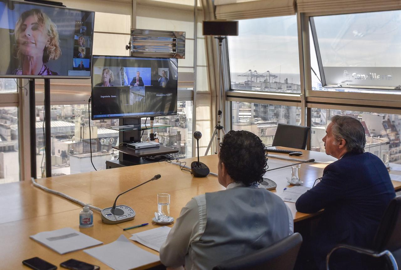 El canciller argentino Felipe Solá participó hoy de una videoconferencia con la Secretaria General del Instituto Ítalo-Latinoamericano (IILA), Antonella Cavallari, y el Embajador de la República Italiana en Argentina, Giuseppe Manzo, para conversar sobre programas y actividades que llevan adelante de forma articulada con Italia, en materia de impulso a las PyMES derechos humanos y cooperación.