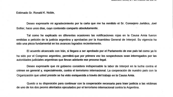 Carta enviada por el canciller Héctor Timerman al Secretario General de Interpol, Ronald K. Noble
