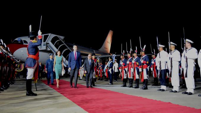 El canciller Jorge Faurie recibió esta noche en Aeroparque a sus Majestades Reales de España, Don Felipe VI y Doña...