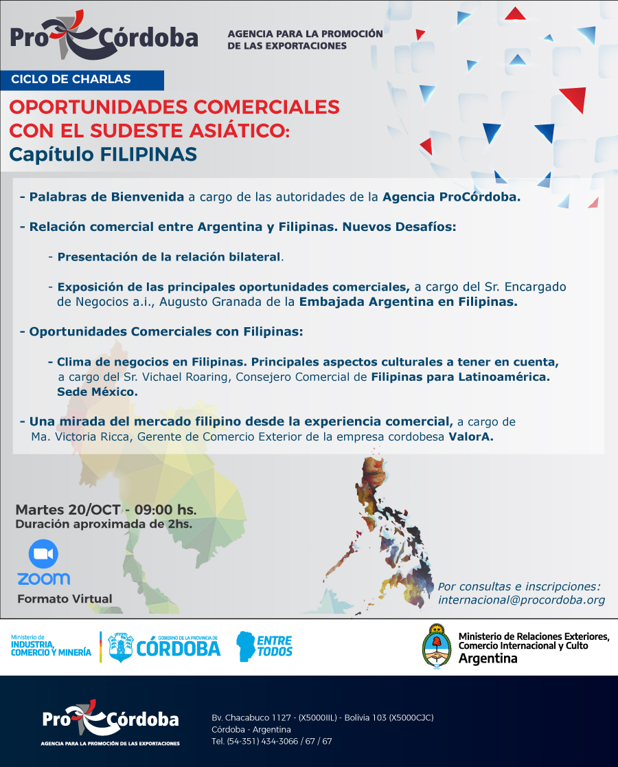 La Cancillería Argentina y ProCórdoba lo invitan a participar del encuentro “Oportunidades comerciales con el sudeste asiático: Capítulo FILIPINAS”.