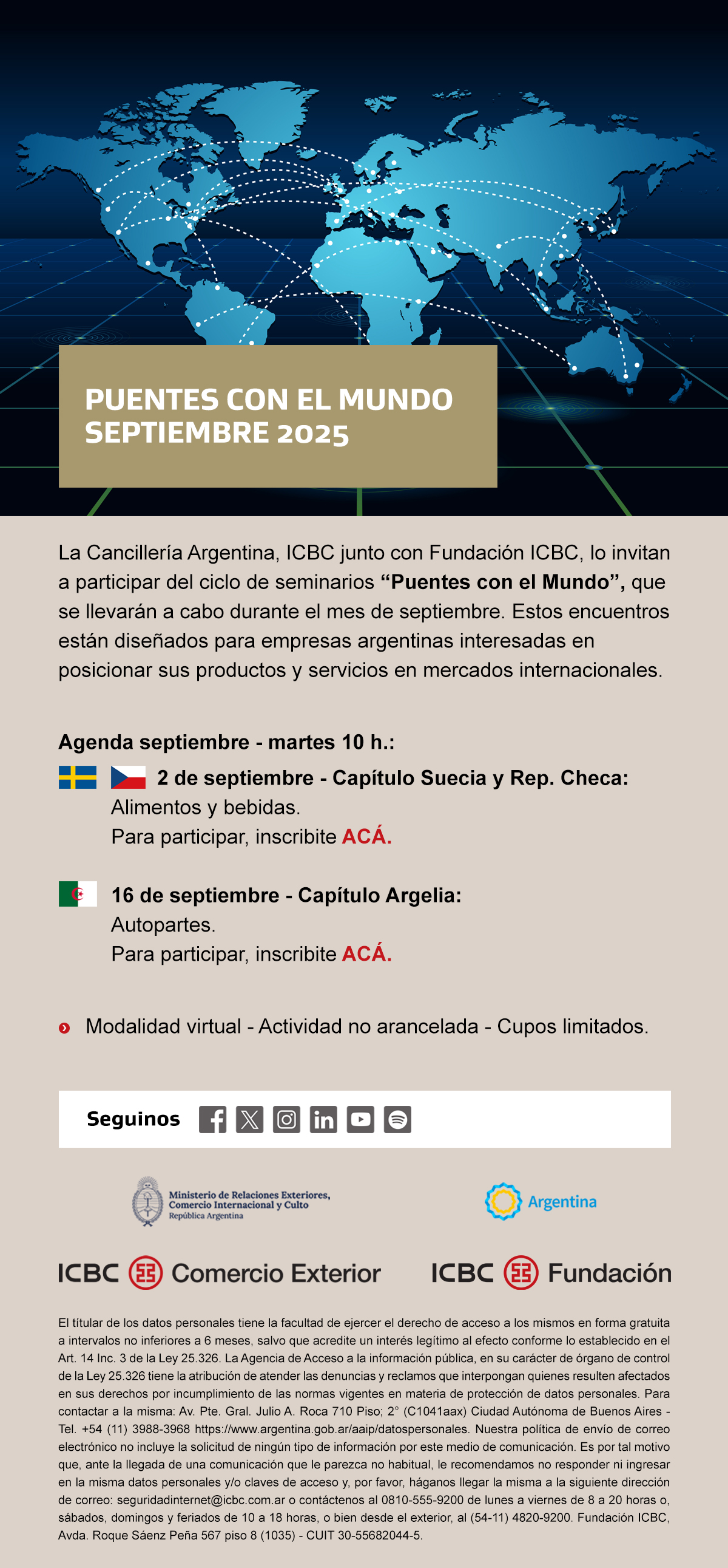 La Cancillería Argentina, ICBC junto con Fundación ICBC, lo invitan a participar del ciclo de seminarios “Puentes con el Mundo”, que se llevarán a cabo durante el mes de septiembre. Estos encuentros están diseñados para empresas argentinas interesadas en posicionar sus productos y servicios en mercados internacionales.