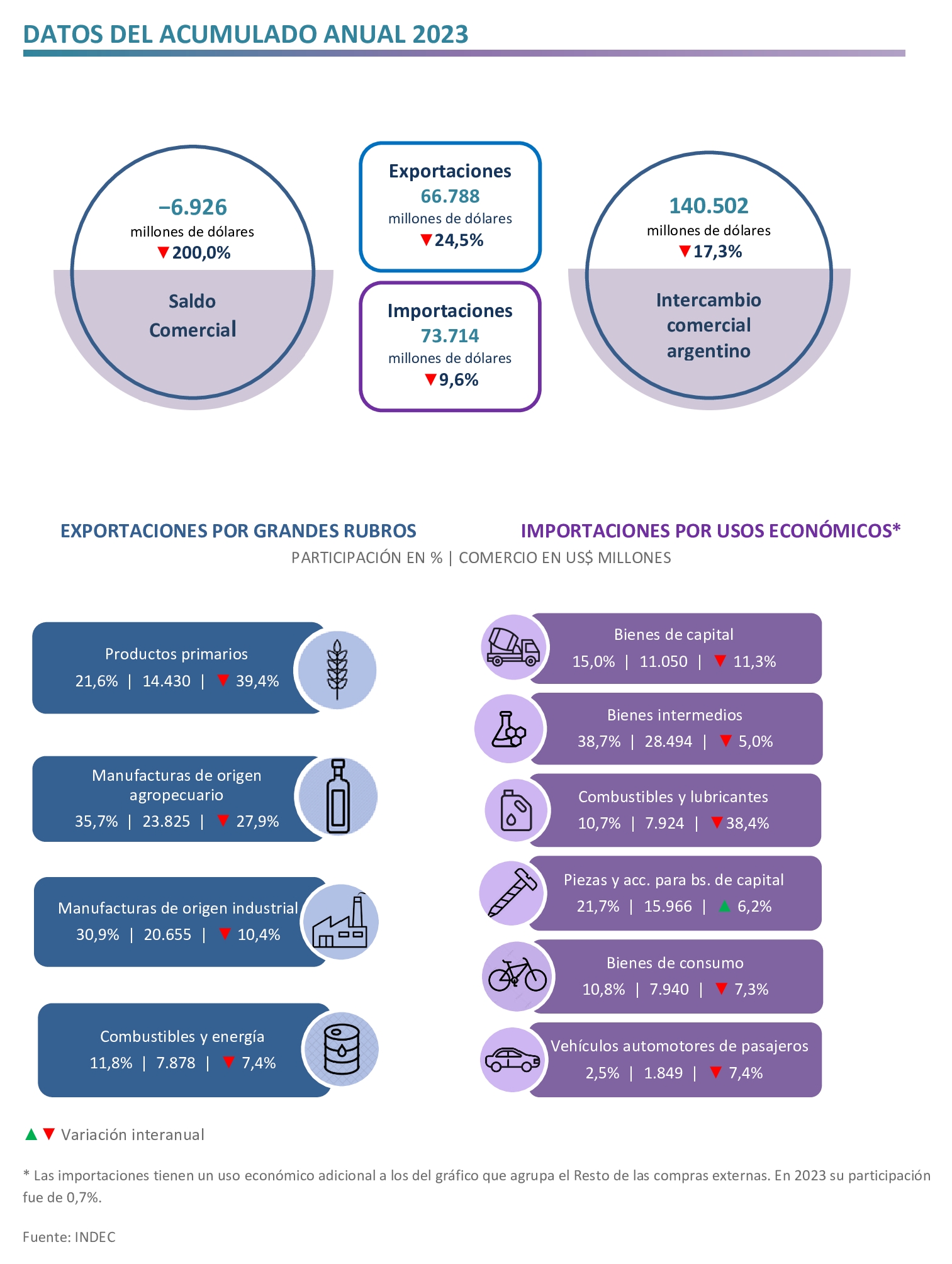 A lo largo de 2023 las exportaciones sumaron US$ 66.788 millones y las importaciones ascendieron a US$ 73.714 millones, lo que arrojó un saldo comercial negativo de US$ 6.926 millones.