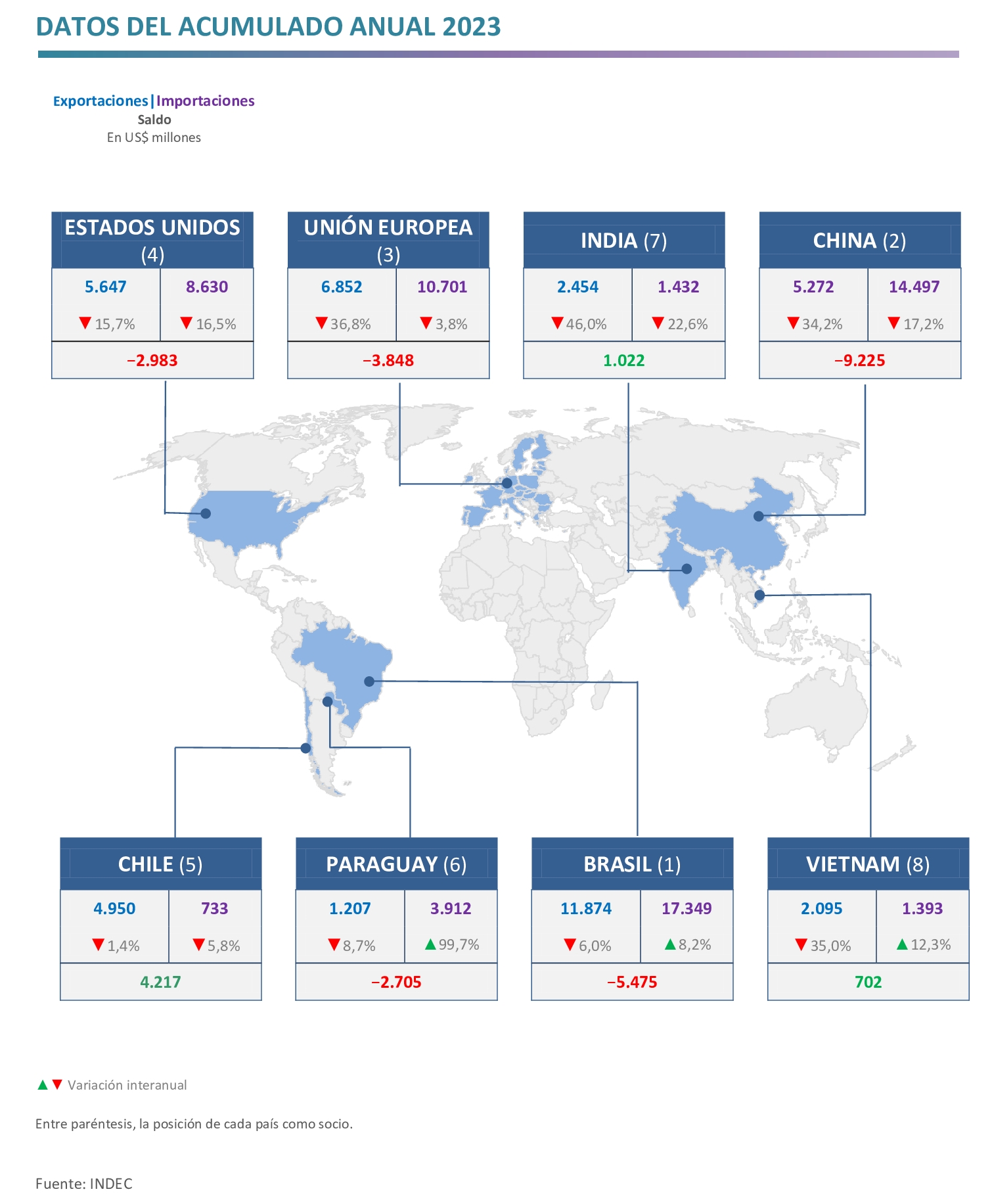 - Los mayores superávits se obtuvieron en el comercio con Chile (US$ 4.217 millones), Perú (US$ 2.310 millones), Uruguay (US$ 1.160 millones) e India (US$ 1.022 millones); mientras que los principales déficits se registraron con China (−US$ 9.225 millones), Brasil (−US$ 5.475 millones), Estados Unidos (−US$ 2.983 millones), Paraguay (−US$ 2.705 millones), Alemania (−US$ 2.020 millones) y Tailandia (−US$ 1.530 millones).