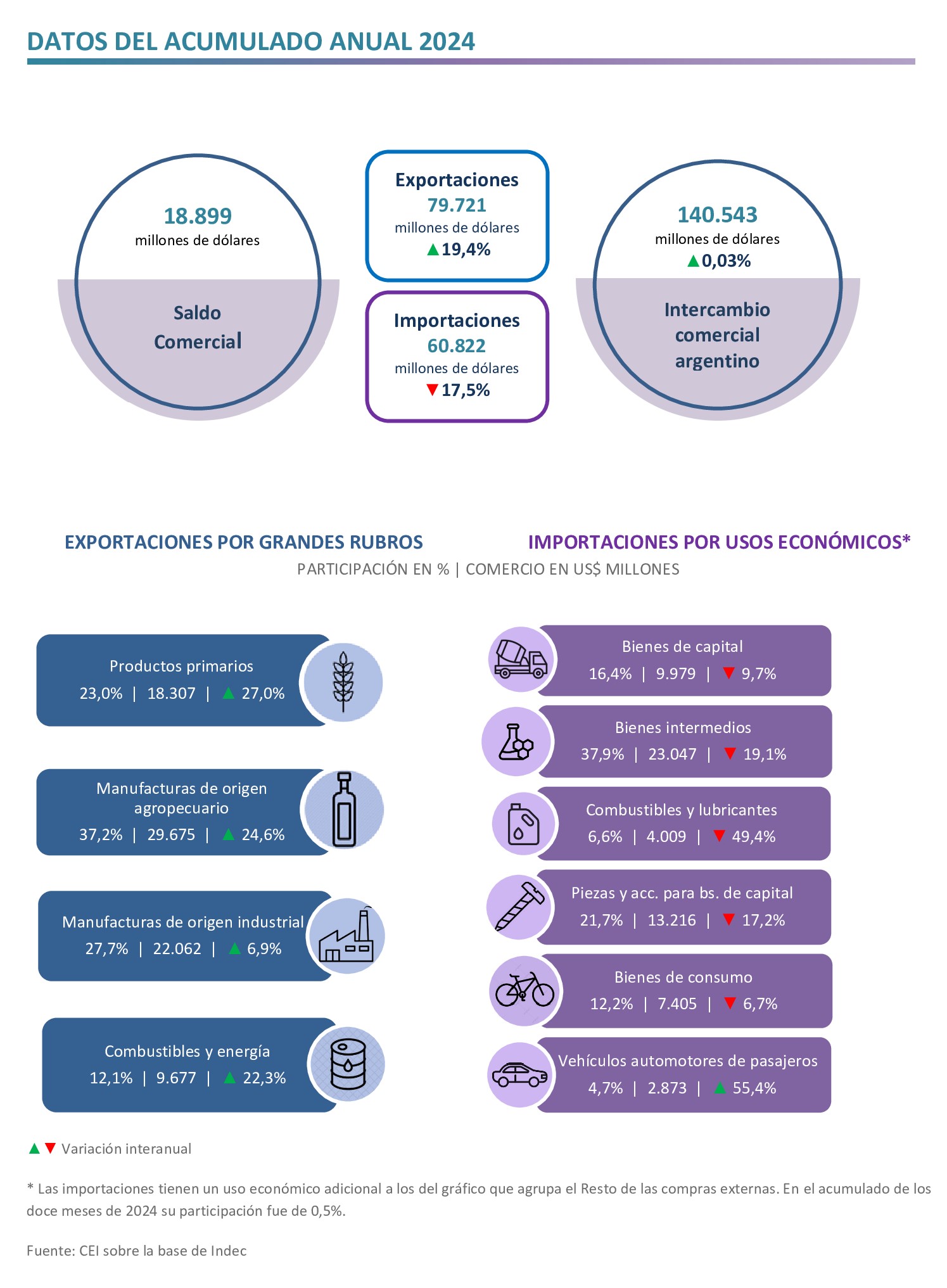 En 2024 las exportaciones crecieron 19,4% respecto al año anterior y alcanzaron US$ 79.721 millones, en tanto que las importaciones cayeron 17,4% y totalizaron US$ 60.822 millones. El balance comercial arrojó un saldo positivo de US$ 18.899 millones.