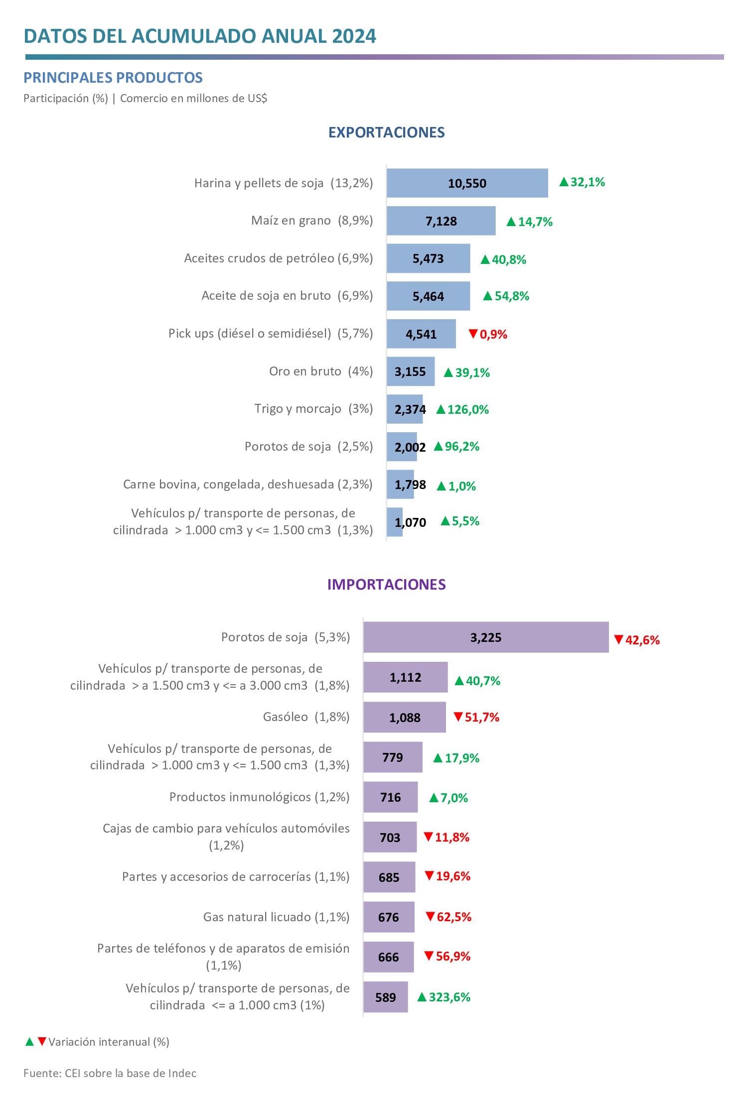 - En cuanto a las importaciones, las caídas más significativas se dieron en las compras de porotos de soja (‑US$ 2.393 millones), gasóleo (‑US$ 1.163 millones) y gas natural licuado (‑US$ 1.124 millones); mientras que crecieron las compras de vehículos para transporte de personas (US$ 1.029 millones) y de mercancías (US$ 317 millones).