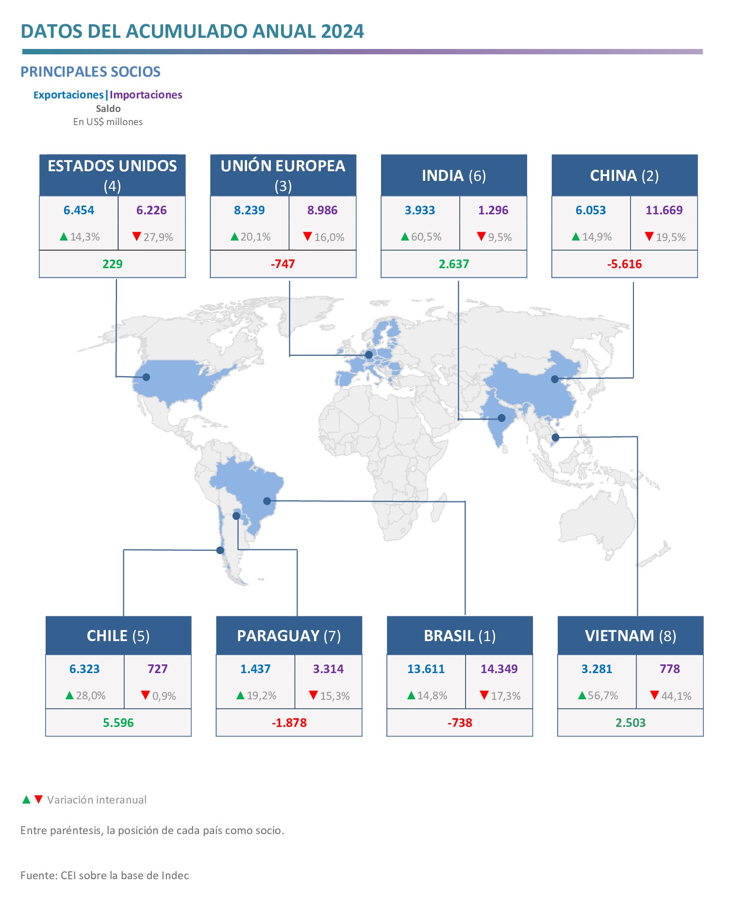 - Los mayores superávits se obtuvieron en el comercio con Chile (US$ 5.596 millones), India (US$ 2.637 millones), Vietnam (US$ 2.503 millones), Perú (US$ 2.242 millones) y Arabia Saudita (US$ 1.399 millones); mientras que los principales déficits se registraron con China (‑US$ 5.616 millones), Paraguay (‑US$ 1.878 millones) y Alemania (‑US$ 1.846 millones).
