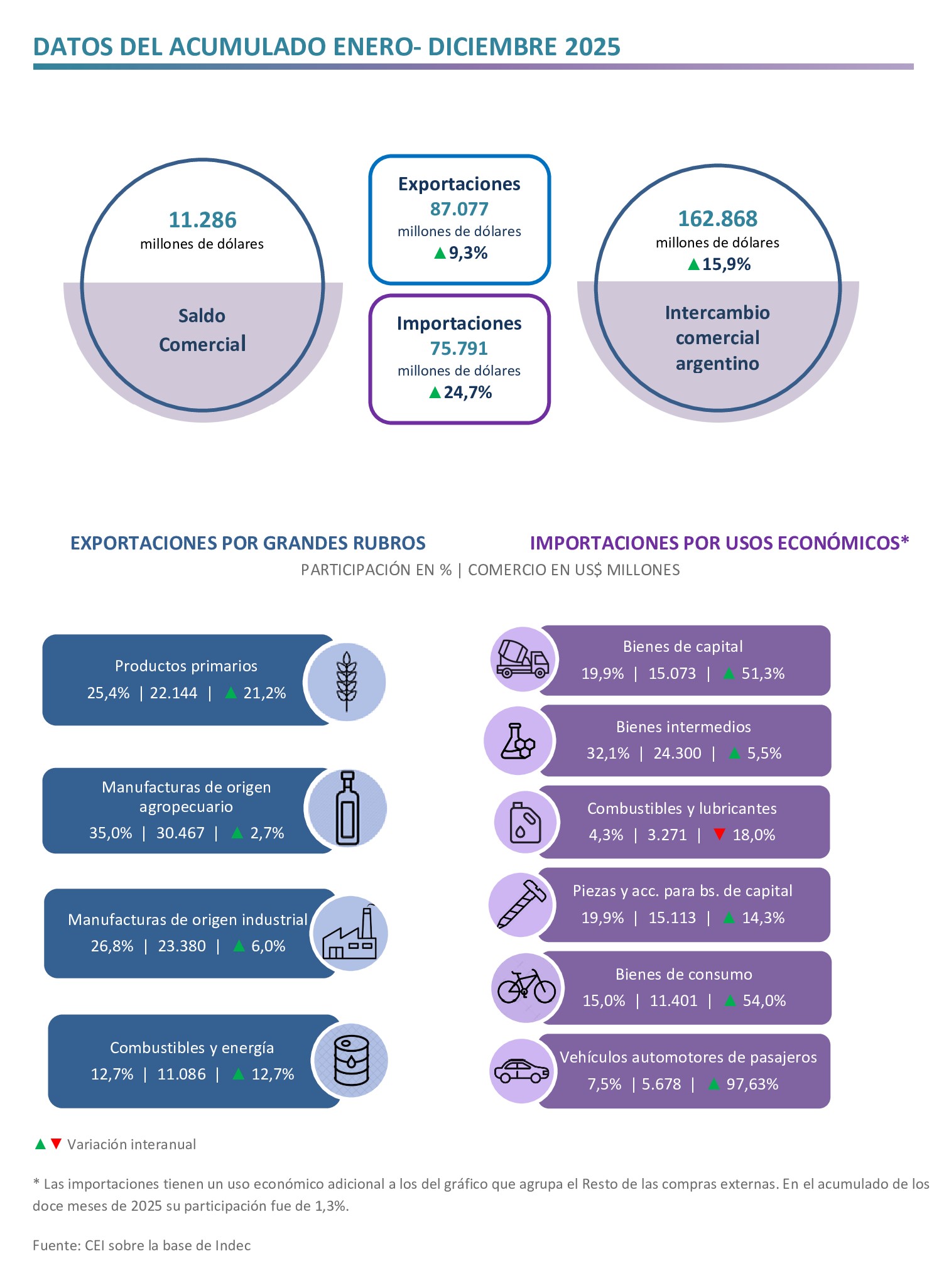 Entre enero y diciembre de 2025 las exportaciones argentinas alcanzaron US$ 87.077 millones (crecieron 9,3% con respecto a 2024), mientras que las importaciones sumaron US$ 75.791 (se incrementaron 24,7% interanual). Como resultado, se registró un superávit comercial de US$ 11.286 millones.