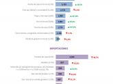 - Resaltan los aumentos en las exportaciones de aceites crudos de petróleo (US$ 1.265 millones), porotos de soja (US$ 1.265 millones), harina y pellets de soja (US$ 1.258 millones) y trigo (US$ 1.218 millones). Las mayores caídas se dieron en carbonatos de litio (‑U$S 186 millones), plata en bruto (‑U$S 171 millones), cebada en grano (‑U$S 166 millones) y vehículos para transporte de personas (‑US$ 150 millones).