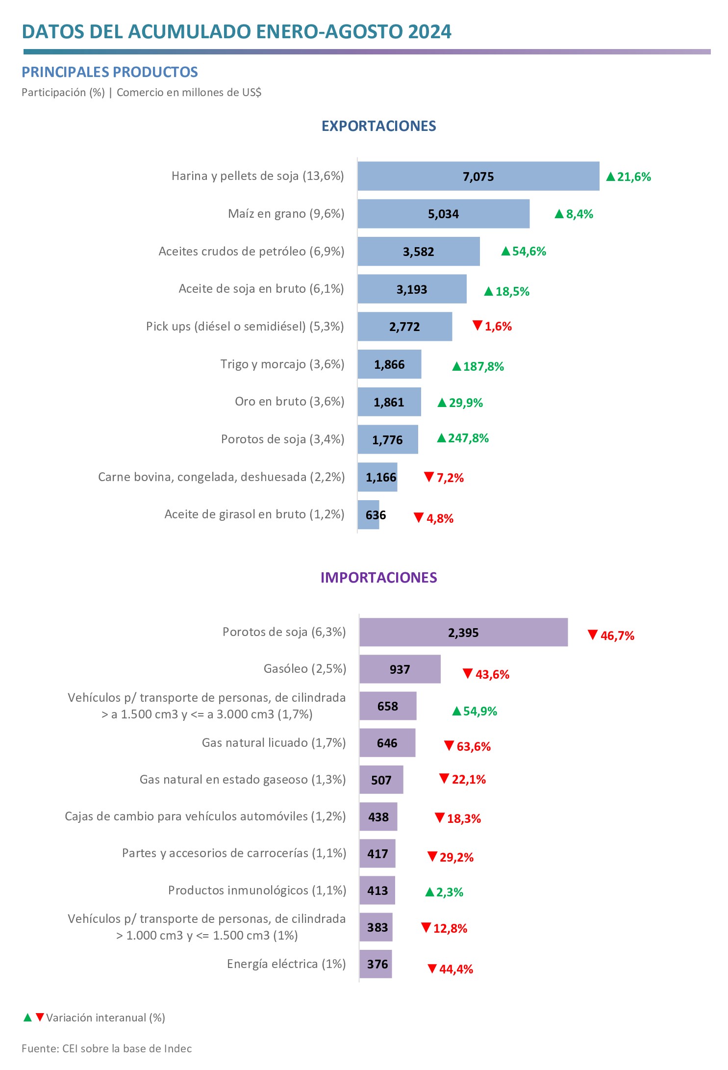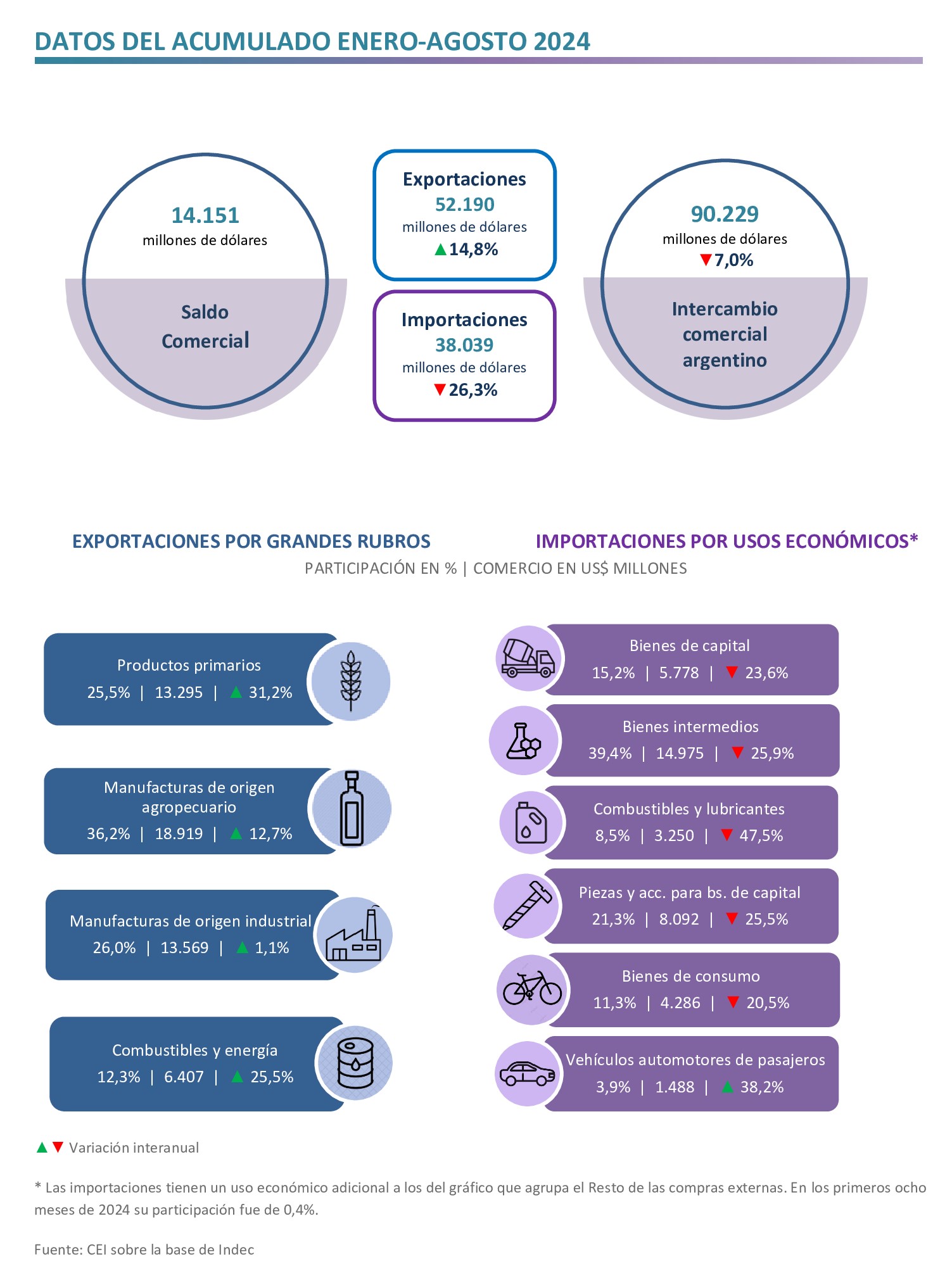 En los primeros ocho meses de 2024, las exportaciones crecieron 14,8% en relación al mismo período de 2023 (alcanzaron US$ 52.190 millones), en tanto que las importaciones cayeron 26,3% interanual (totalizaron US$ 38.039 millones). De esta forma, el saldo comercial alcanzó un superávit de US$ 14.151 millones.