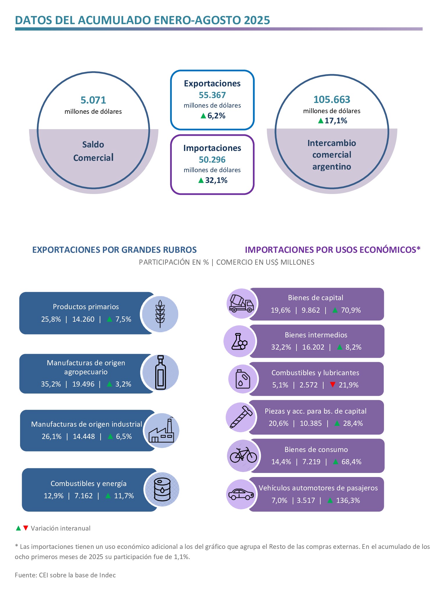 En los primeros ocho meses del año, las exportaciones argentinas alcanzaron US$ 55.367 millones (aumentaron 6,2% respecto al mismo período de 2024), mientras que las importaciones totalizaron US$ 50.296 millones (crecieron 32,1% i.a.). De esta forma, se registró un superávit comercial de US$ 5.071 millones.