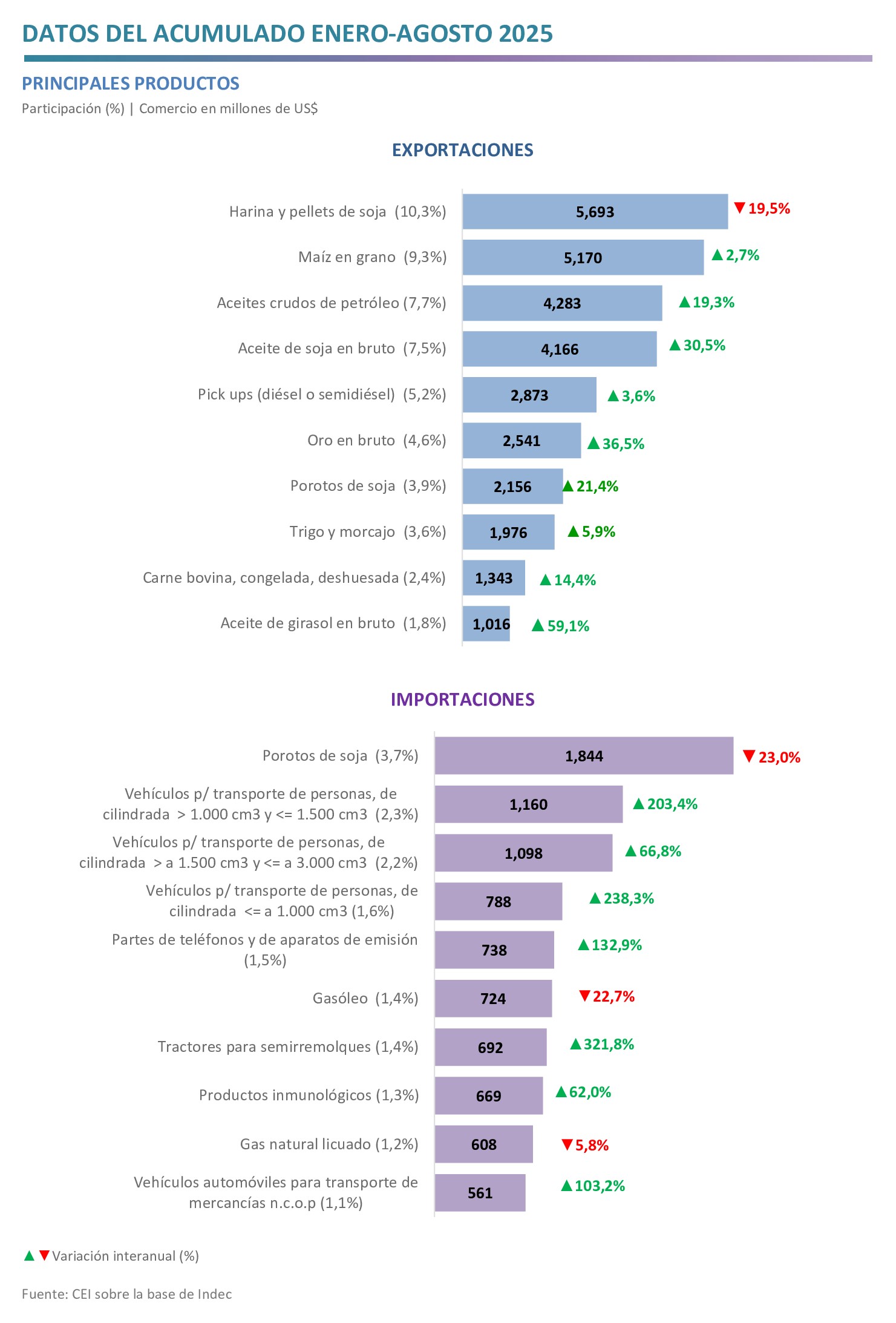 - Con respecto a las exportaciones, sobresalen los incrementos en las ventas de aceite de soja en bruto (US$ 972 millones), aceites crudos de petróleo (US$ 693 millones), oro en bruto (US$ 680 millones) y porotos de soja (US$ 380 millones); mientras que las mayores caídas se dieron en harina y pellets de soja (‑U$S 1.383 millones), camarones y langostinos congelados (‑U$S 205 millones) y vehículos automóviles para transporte de personas (‑U$S 187 millones).