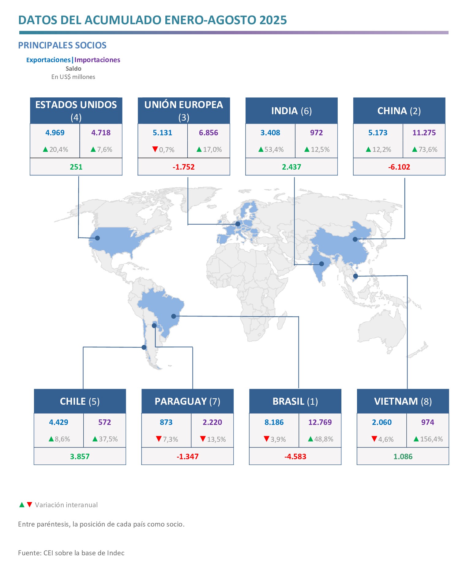 - Los principales destinos de las exportaciones fueron Brasil, con una participación de 14,8%; China, con 9,3%; la Unión Europea, con 9,3%; y Estados Unidos, con 9,0%. Por su parte, los orígenes de las importaciones más destacados fueron: Brasil, con 25,4% del total; China, con 22,4%; la con UE, 13,6%; y Estados Unidos, con 9,4%.