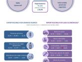 - Respecto de las importaciones, las subas más representativas se dieron en las compras de vehículos para transporte de personas (US$ 2.783 millones), chasis, partes y neumáticos (US$ 1.184 millones), vehículos para transporte de mercancías (US$ 831 millones) y partes de teléfonos (US$ 282 millones); mientras que disminuyeron las de porotos de soja (‑US$ 965 millones), gas natural en estado gaseoso (‑US$ 571 millones) y gasóleo (‑US$ 234 millones).