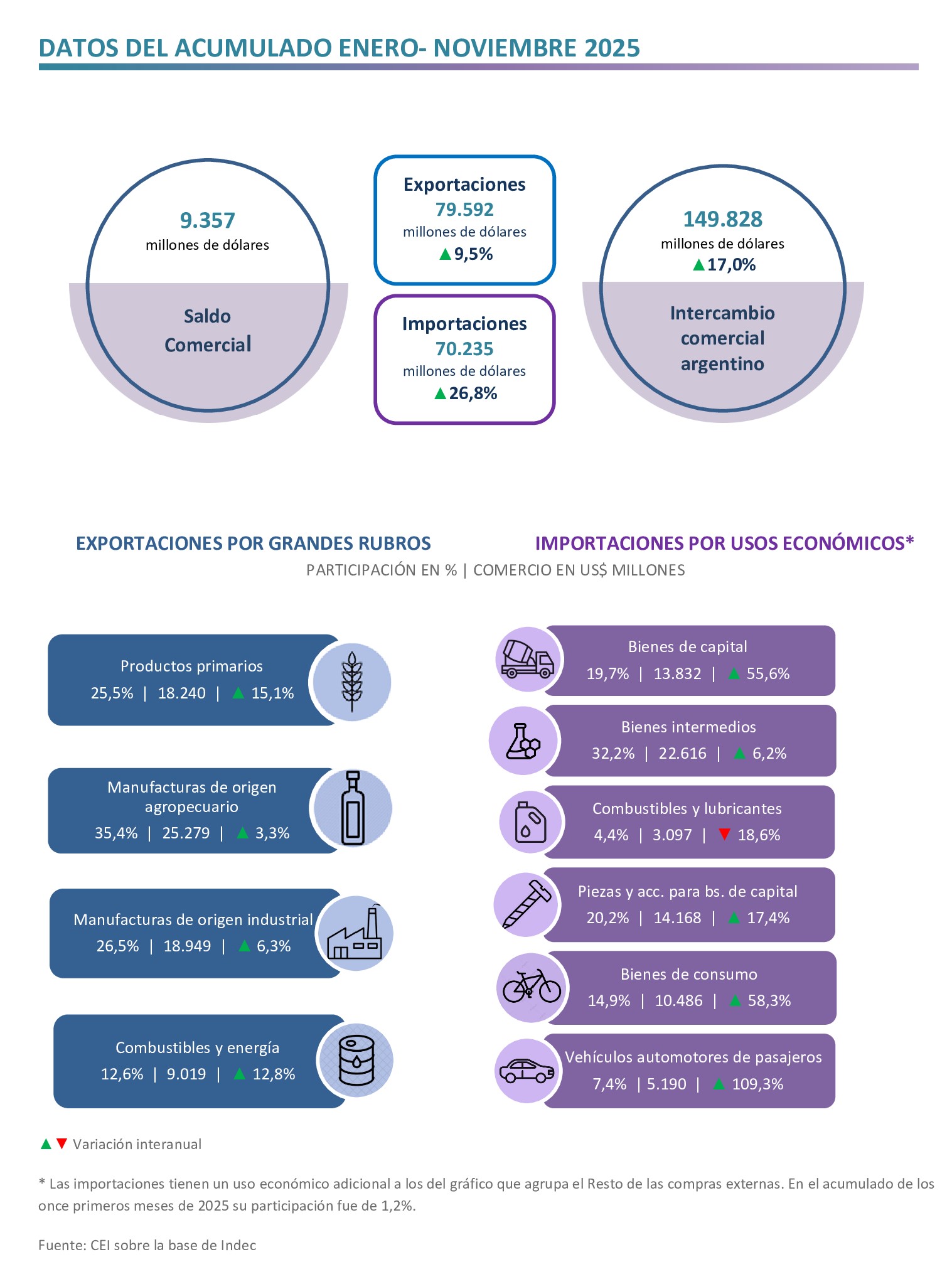 En el acumulado de los primeros once meses de 2025, las exportaciones sumaron US$ 79.592 millones (aumentaron 9,5% en relación a igual período de 2024) y las importaciones totalizaron US$ 70.235 millones (crecieron 26,8% i.a.). En consecuencia, se registró un superávit comercial de US$ 9.357 millones.