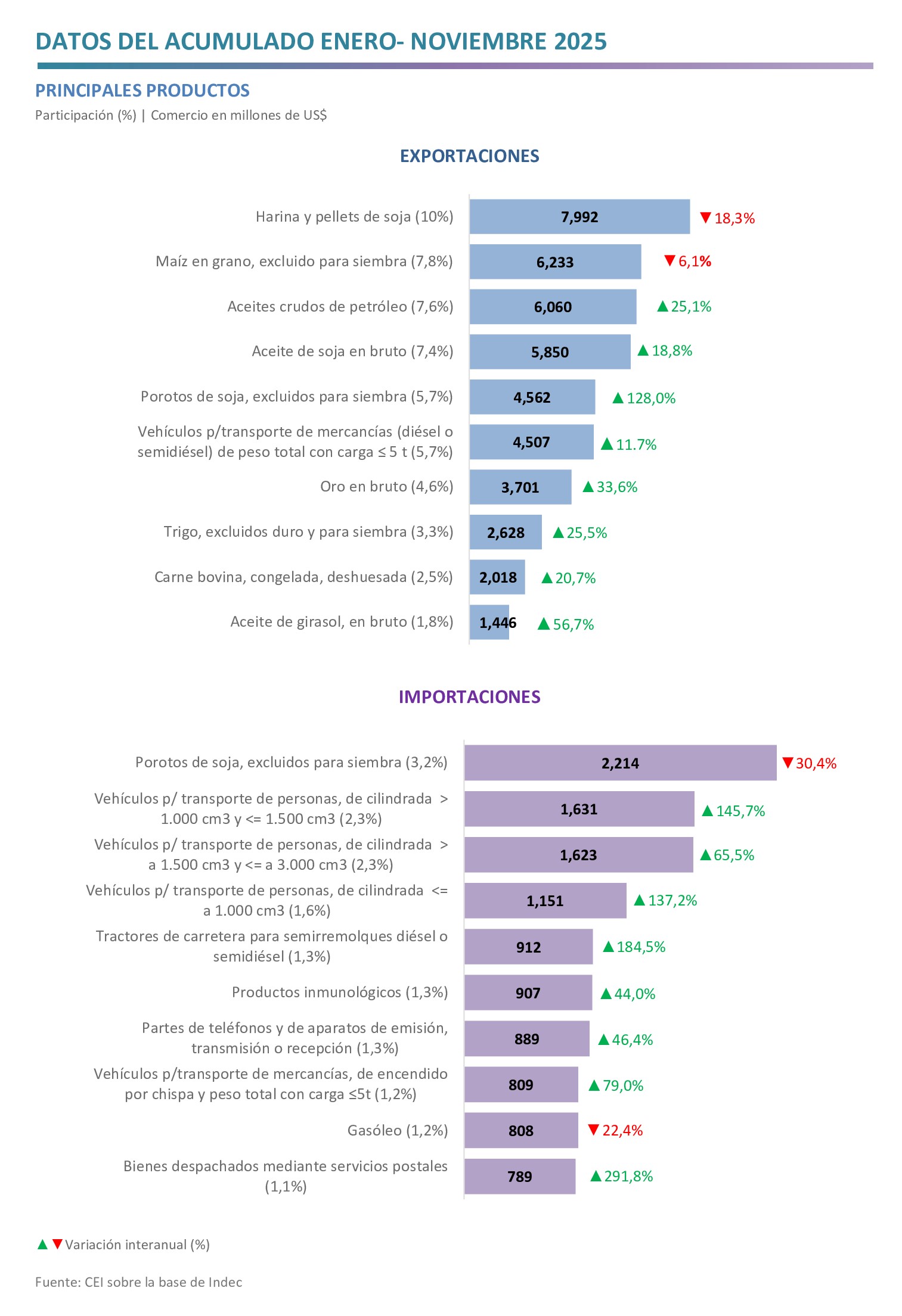 - Resaltan los aumentos en las exportaciones de porotos de soja (US$ 2.561 millones), aceites crudos de petróleo (US$ 1.214 millones), oro en bruto (US$ 932 millones) y aceite de soja en bruto (US$ 927 millones); mientras que las mayores caídas se dieron en harina y pellets de soja (‑U$S 1.790 millones), vehículos automóviles para transporte de personas (‑U$S 542 millones) y maíz (‑U$S 407 millones).