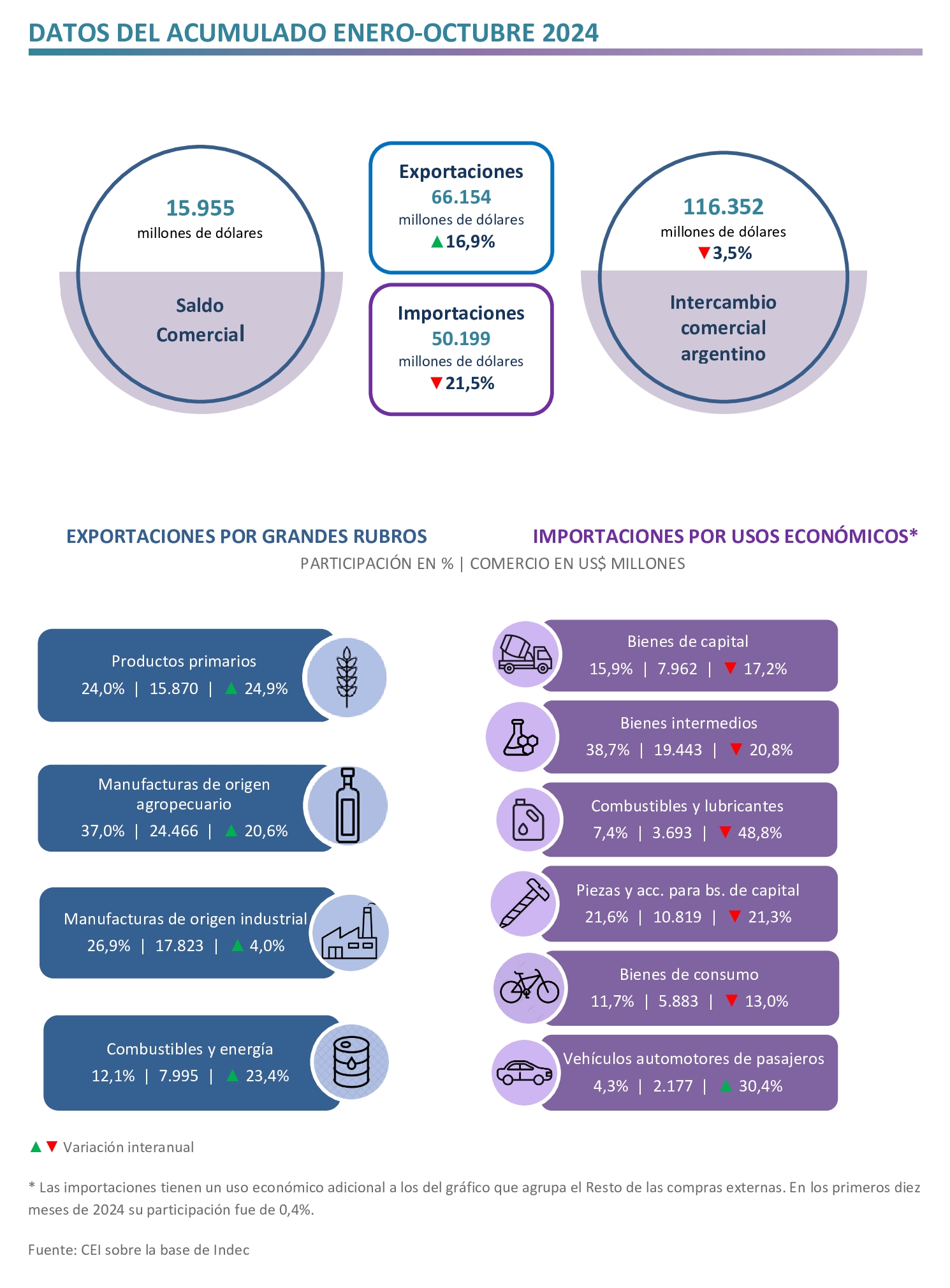 - En el período enero-octubre de 2024, las exportaciones totalizaron US$ 66.154 millones, lo que representa un incremento interanual de 16,9%, explicado por un aumento de 24,6% en las cantidades exportadas que superó la caída de 6,2% en los precios.