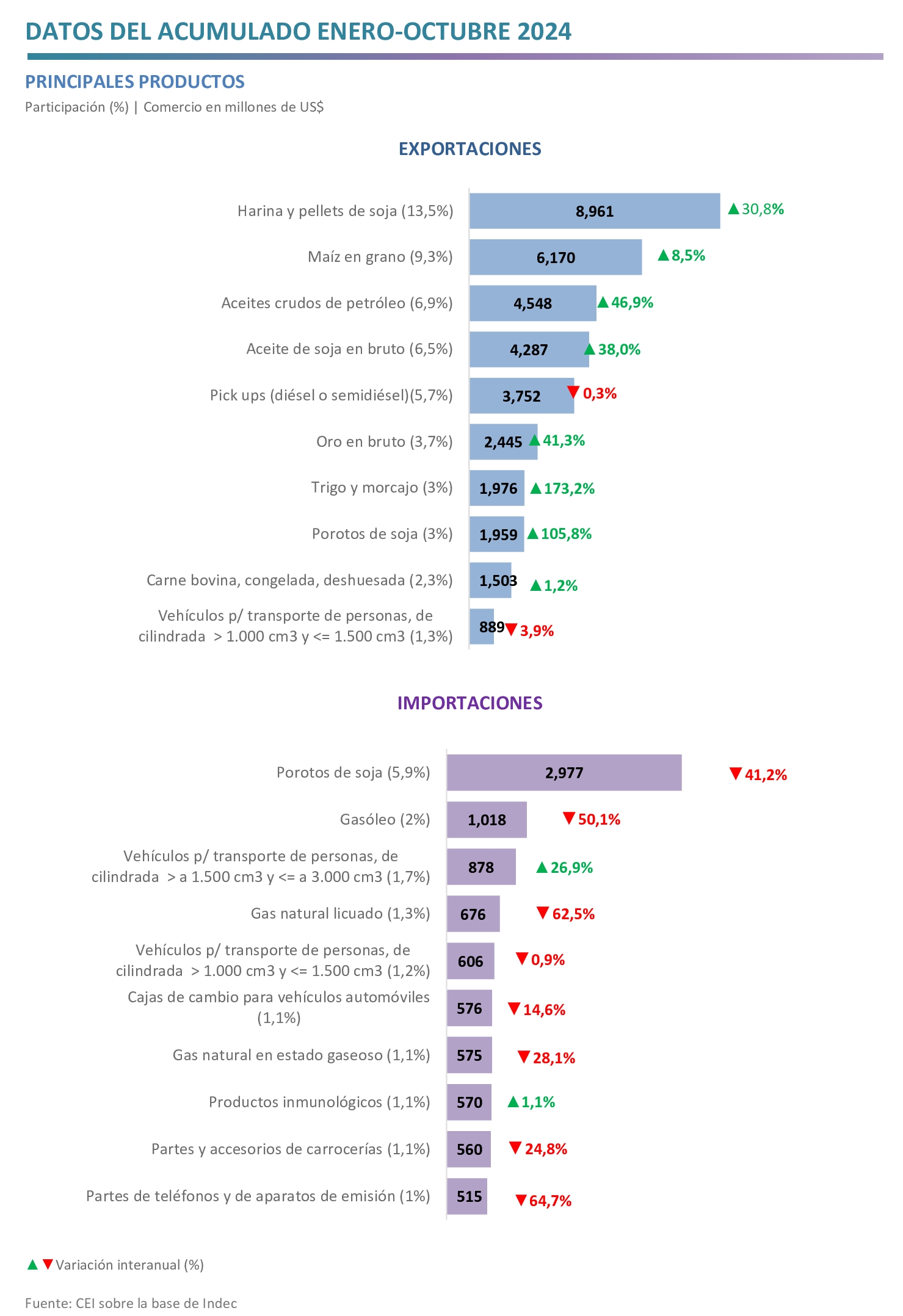 - Respecto de las importaciones, las caídas más significativas se dieron en las compras de porotos de soja (‑US$ 2.088 millones), gas natural licuado (‑US$ 1.124 millones) y gasóleo (‑US$ 1.022 millones); mientras que crecieron las de vehículos para transporte de personas (US$ 502 millones) y de mercancías (US$ 184 millones).