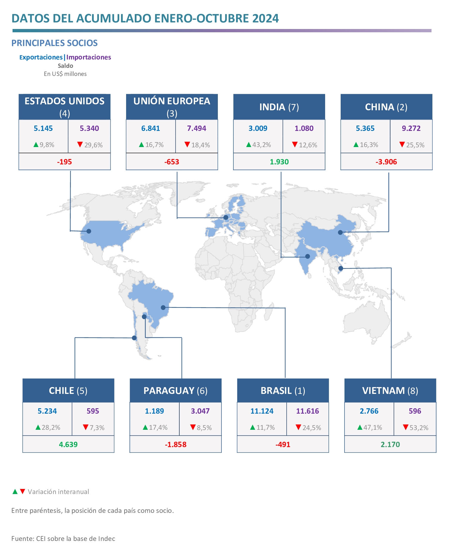 - Los mayores superávits se obtuvieron en el comercio con Chile (US$ 4.639 millones), Vietnam (US$ 2.170 millones), India (US$ 1.930 millones), Perú (US$ 1.872 millones) y Arabia Saudita (US$ 1.117 millones); mientras que los principales déficits se registraron con China (‑US$ 3.906 millones), Paraguay (‑US$ 1.858 millones) y Alemania (‑US$ 1.526 millones).