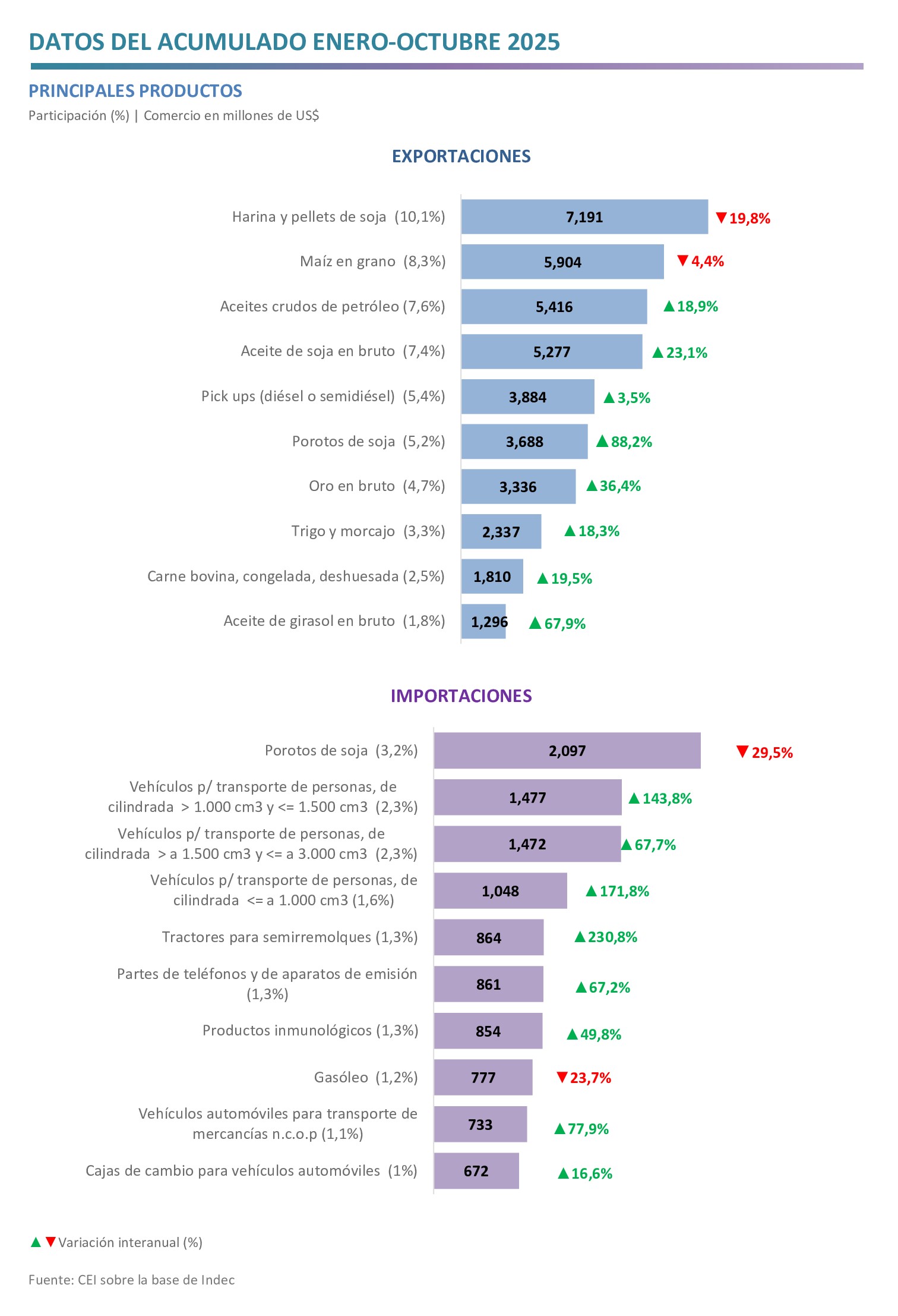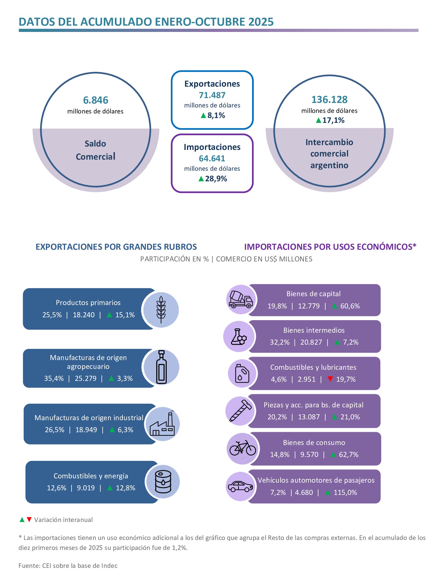 En el acumulado de los primeros diez meses de 2025, las exportaciones sumaron US$ 71.487 millones (aumentaron 8,1% en relación a igual período de 2024) y las importaciones totalizaron US$ 64.641 millones (crecieron 28,9% interanual). Por consiguiente, se alcanzó un superávit comercial de US$ 6.846 millones.