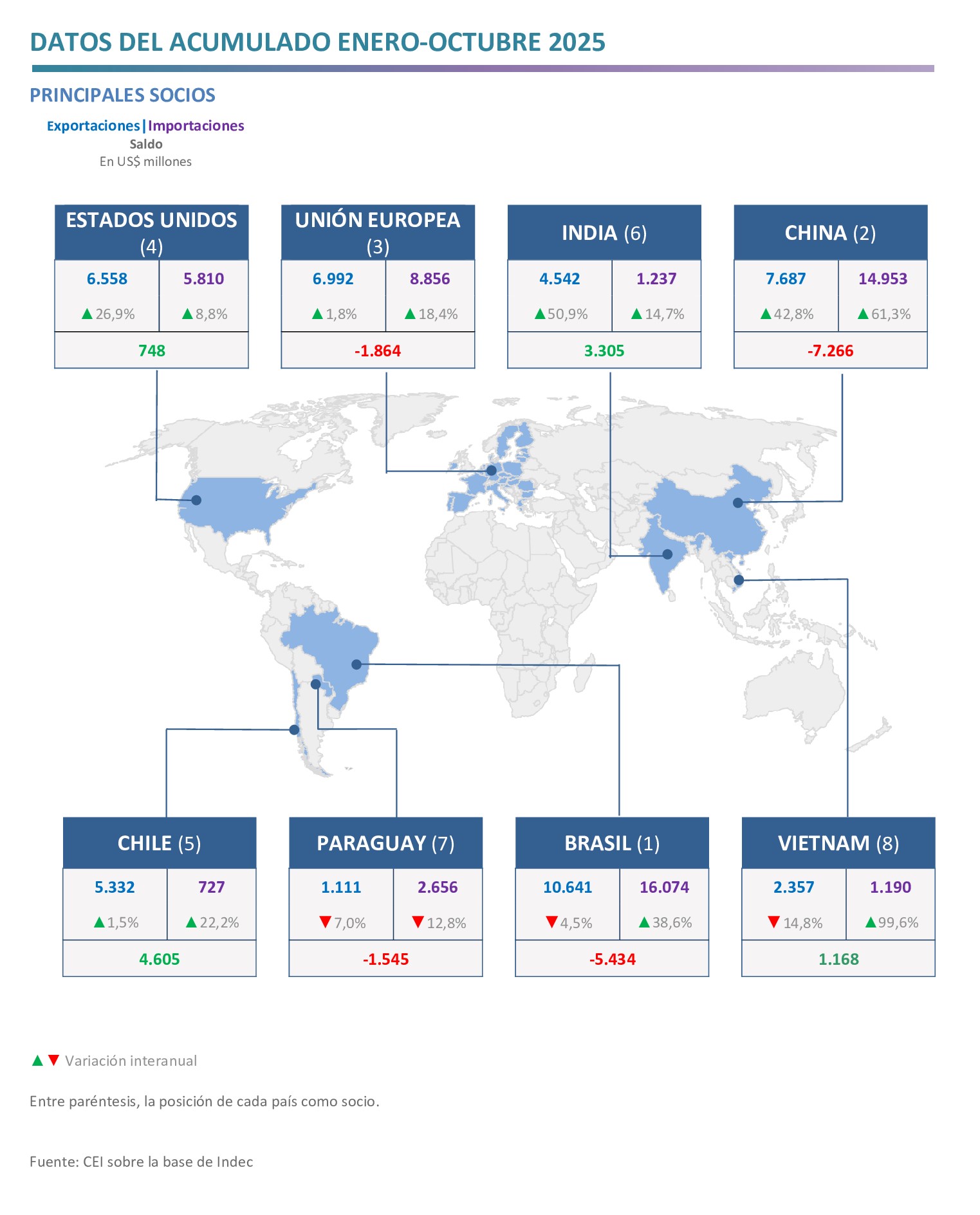 - Los mayores superávits se obtuvieron en el comercio con Chile (US$ 4.605 millones), India (US$ 3.305 millones), Perú (US$ 1.782 millones), Países Bajos (US$ 1.236 millones) y Vietnam (US$ 1.168 millones); mientras que los principales déficits se registraron con China (-US$ 7.266 millones), Brasil (-US$ 5.434 millones) y Alemania (-US$ 1.794 millones).