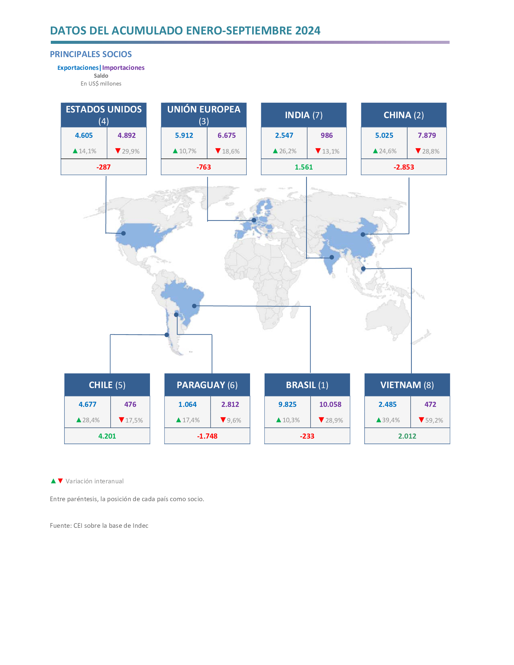 - Los mayores superávits se obtuvieron en el comercio con Chile (US$ 4.201 millones), Vietnam (US$ 2.012 millones), Perú (US$ 1.691 millones), India (US$ 1.561 millones) y Arabia Saudita (US$ 1.009 millones); mientras que los principales déficits se registraron con China (‑US$ 2.853 millones), Paraguay (‑US$ 1.748 millones) y Alemania (‑US$ 1.371 millones).