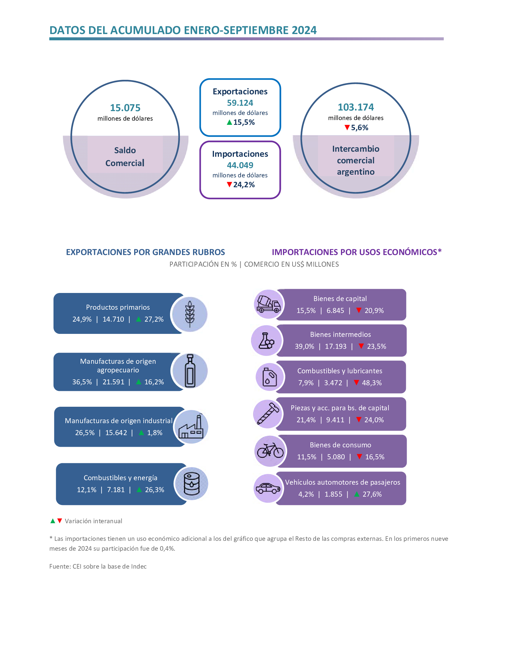 - En el período enero-septiembre de 2024, las exportaciones totalizaron US$ 59.124 millones, lo que representa un incremento interanual de 15,5%, explicado por un aumento de 23,8% en las cantidades exportadas que superó la caída de 10,6% en los precios.