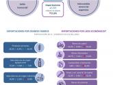 - Resaltan los aumentos en las exportaciones de trigo (US$ 1.049 millones, principalmente a Brasil e Indonesia), aceites crudos de petróleo (US$ 634 millones), maíz (US$ 574 millones), y harina y pellets de soja (US$ 519 millones). Aunque con menor crecimiento absoluto, sobresalen además las mayores ventas de carne bovina deshuesada, tanto congelada (principalmente a China) como fresca o refrigerada (a Alemania). Por otra parte, las caídas más significativas se dieron en las exportaciones de vehículos para transporte de mercancías (−US$ 236 millones), plata en bruto (−U$S 111 millones), gas natural en estado gaseoso (−US$ 111 millones) y biodiésel (−US$ 104 millones).