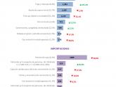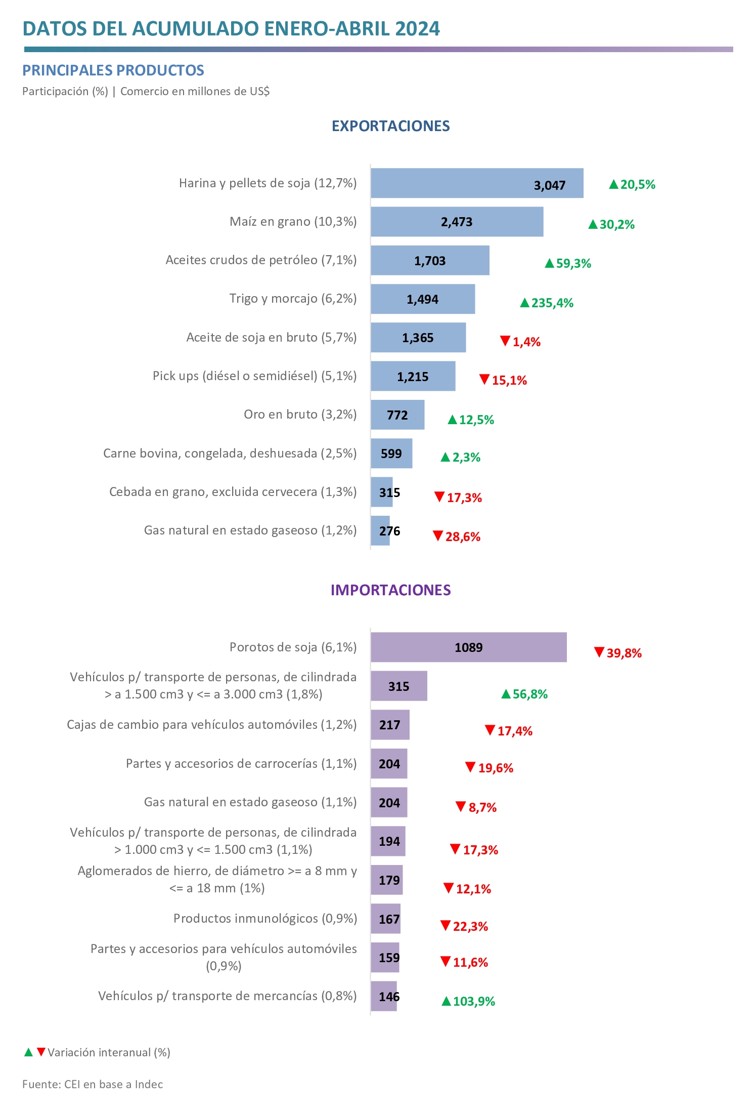 - Respecto de las importaciones, las caídas más importantes se dieron en las compras de gasóleo (−US$ 881 millones), porotos de soja (−US$ 720 millones) y partes de teléfonos y de aparatos de emisión, transmisión o recepción (−US$ 573 millones); mientras que crecieron las importaciones de vehículos para transporte de personas de cilindrada >1500 cm3 y <=3000 cm3 (US$ 114 millones) y urea (US$ 79 millones).