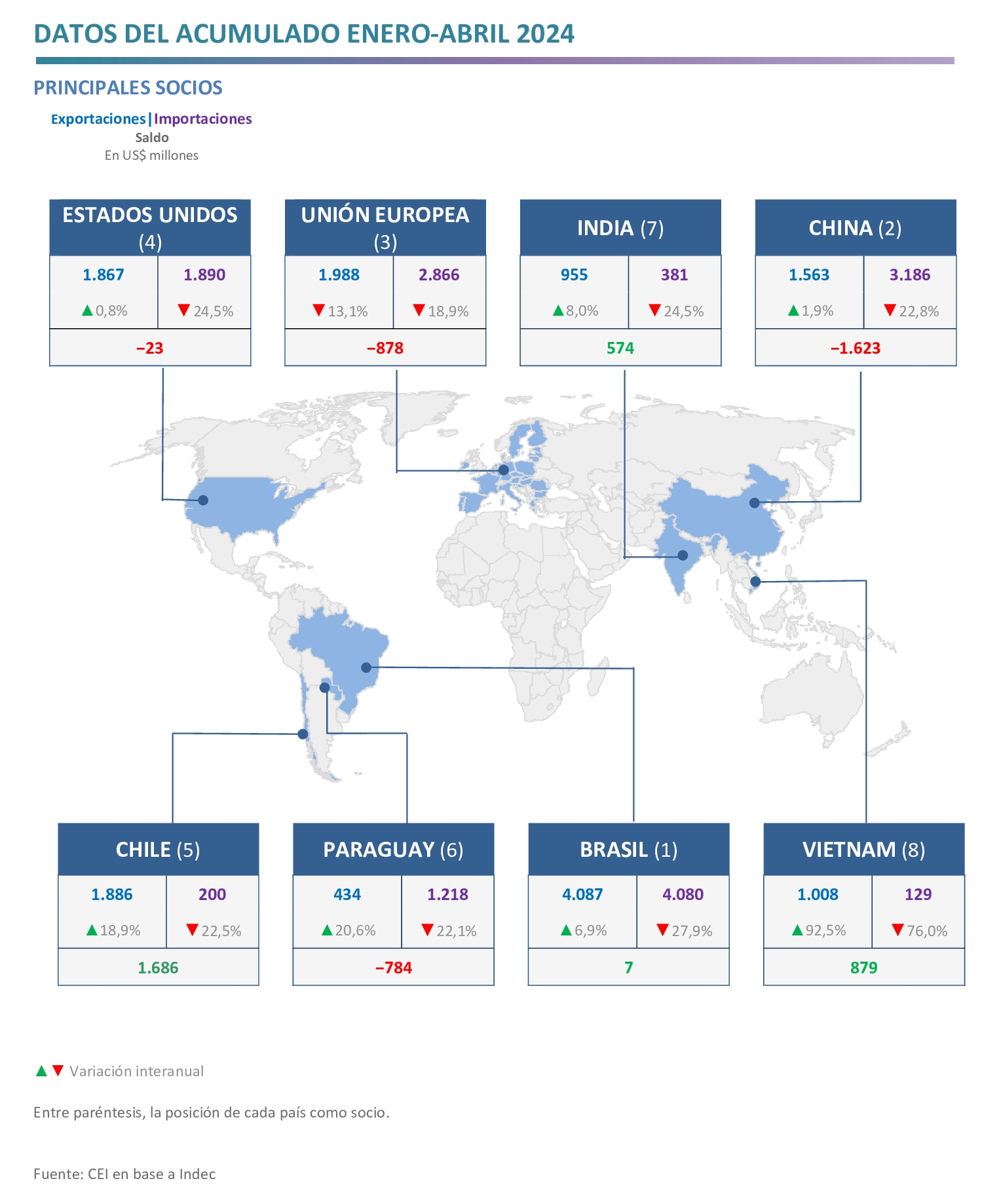 - Los mayores superávits se obtuvieron en el comercio con Chile (US$ 1.686 millones), Vietnam (US$ 879 millones), Perú (US$ 815 millones), India (US$ 574 millones), Indonesia (US$ 525 millones) y Arabia Saudita (US$ 472 millones); mientras que los principales déficits se registraron con China (−US$ 1.623 millones), Paraguay (−US$ 784 millones) y Alemania (−US$ 597 millones).