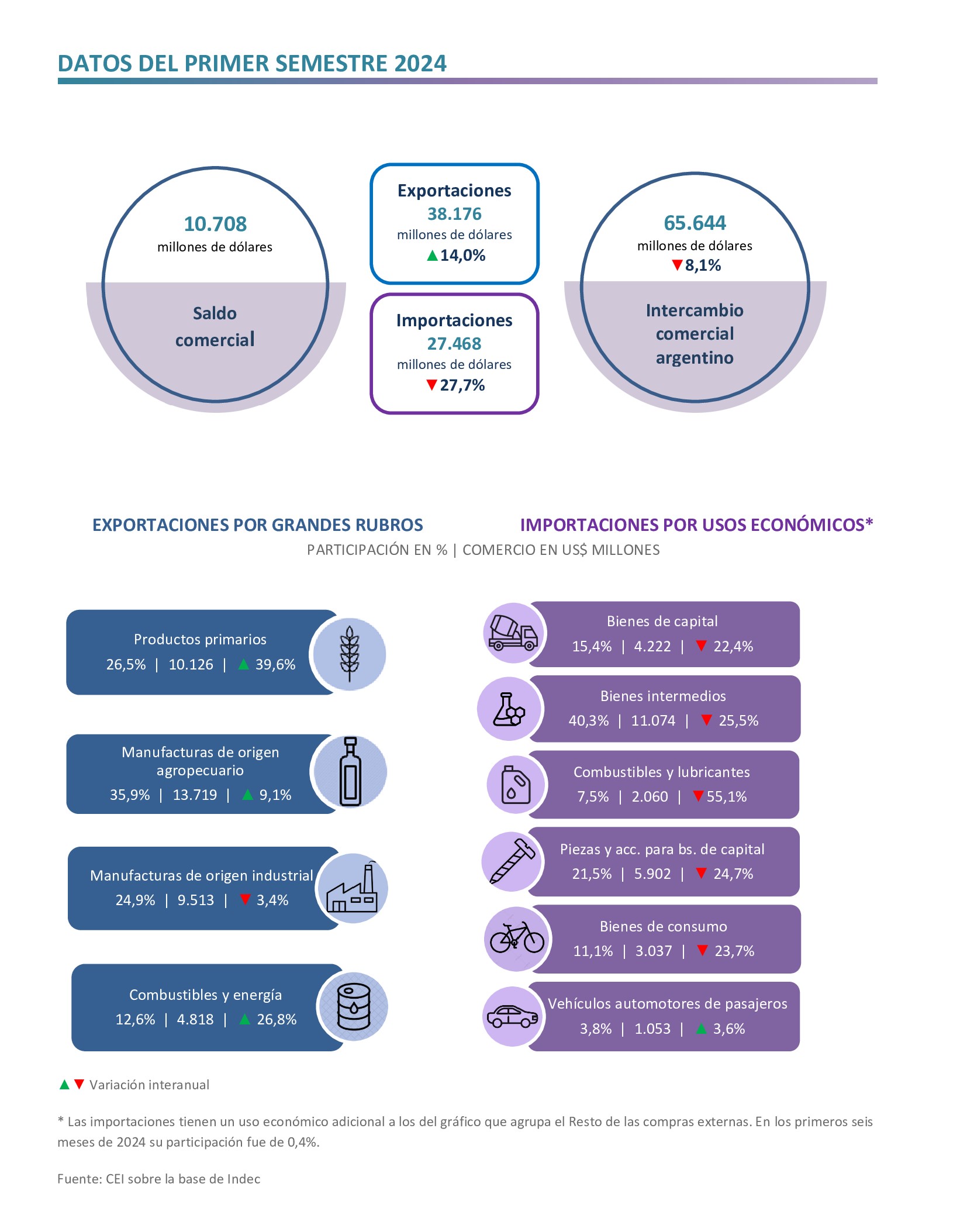 En los primeros seis meses de 2024 las exportaciones sumaron US$ 38.176 millones (crecieron 14,0% interanual), en tanto que las importaciones totalizaron US$ 27.468 millones (cayeron 27,7% i.a.). De esta forma, se alcanzó un superávit comercial de US$ 10.708 millones.