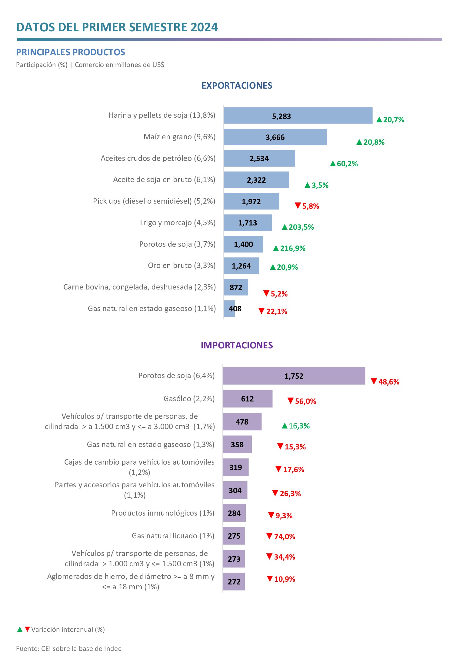 - Como resultado, el saldo comercial fue superavitario en US$ 10.708 millones, cuando en el primer semestre de 2023 había sido deficitario en US$ 4.493 millones.