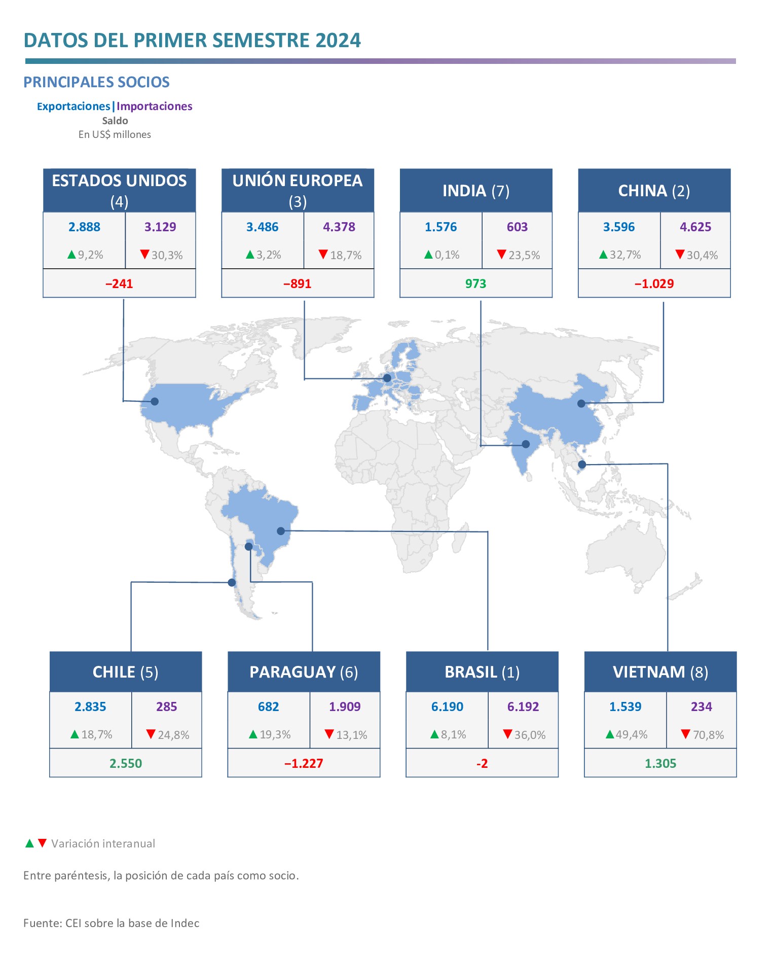 - Los principales destinos de las exportaciones fueron Brasil (con una participación de 16,2%), China (9,4%), la UE (9,1%), Estados Unidos (7,6%), y Chile (7,4%). Por su parte, los orígenes de las importaciones más relevantes fueron Brasil (22,5%), China (16,8%), la UE (15,9%) y Estados Unidos (11,4%).
