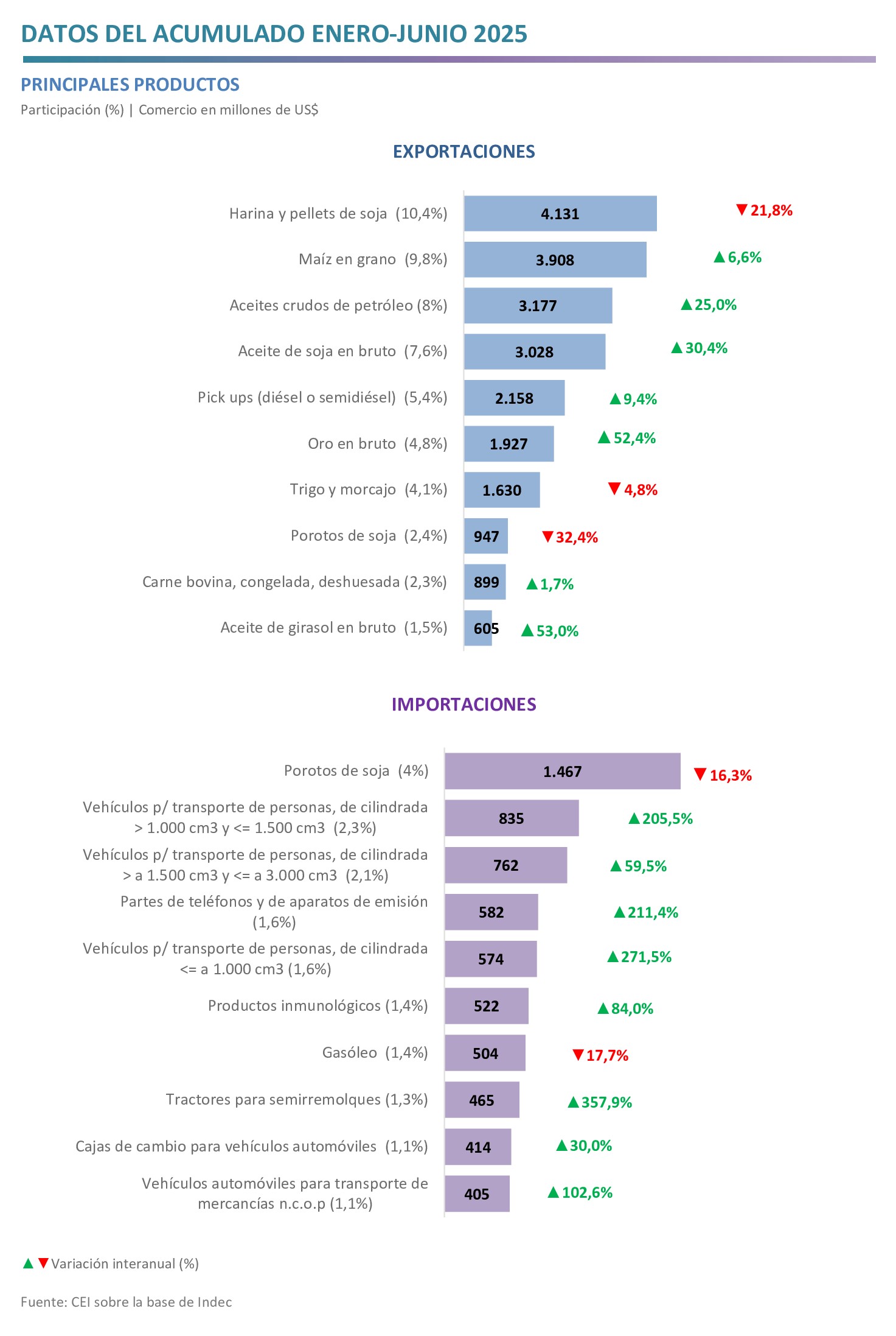 En los primeros seis meses de 2025 las exportaciones alcanzaron US$ 39.742 millones (crecieron 4,0% respecto a igual período de 2024) en tanto que las importaciones totalizaron US$ 36.954 millones (se incrementaron 34,6% i.a.). De esta forma, se registró un superávit comercial de US$ 2.788 millones.