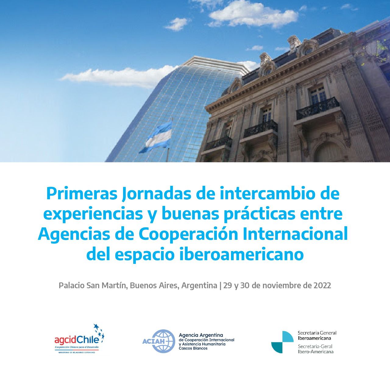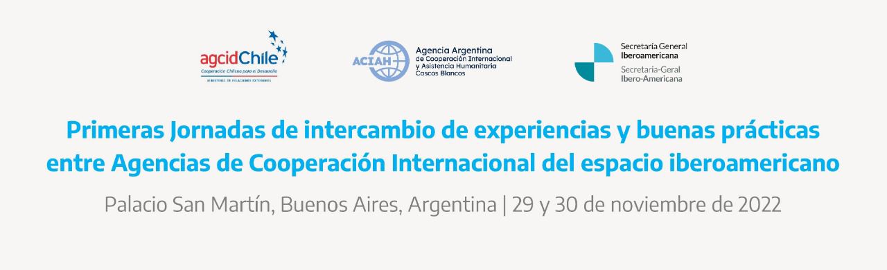 Este 29 y 30 de noviembre se llevarán a cabo en el Palacio San Martín de la Cancillería argentina las “Primeras Jornadas de intercambio de experiencias y buenas prácticas entre Agencias de Cooperación Internacional del espacio Iberoamericano”. El encuentro se propone fortalecer a las agencias de cooperación del espacio Iberoamericano, así como dinamizar sus agendas de trabajo. Las jornadas se encuentran co-organizadas por la Agencia Argentina de Cooperación Internacional y Asistencia Humanitaria - Cascos Blancos (ACIAH), la Secretaría General Iberoamericana (SEGIB) y la Agencia Chilena de Cooperación Internacional para el Desarrollo (AGCID).