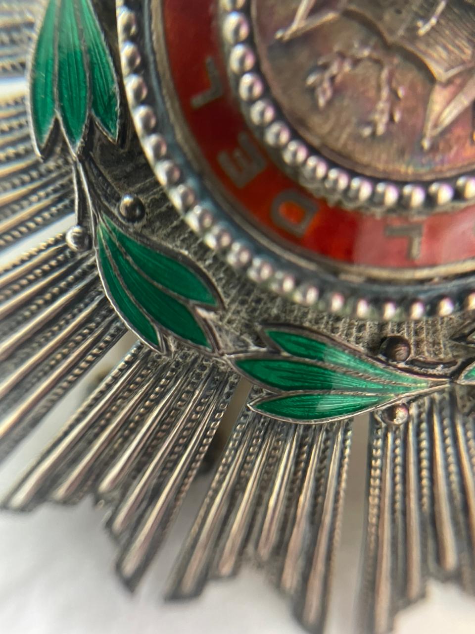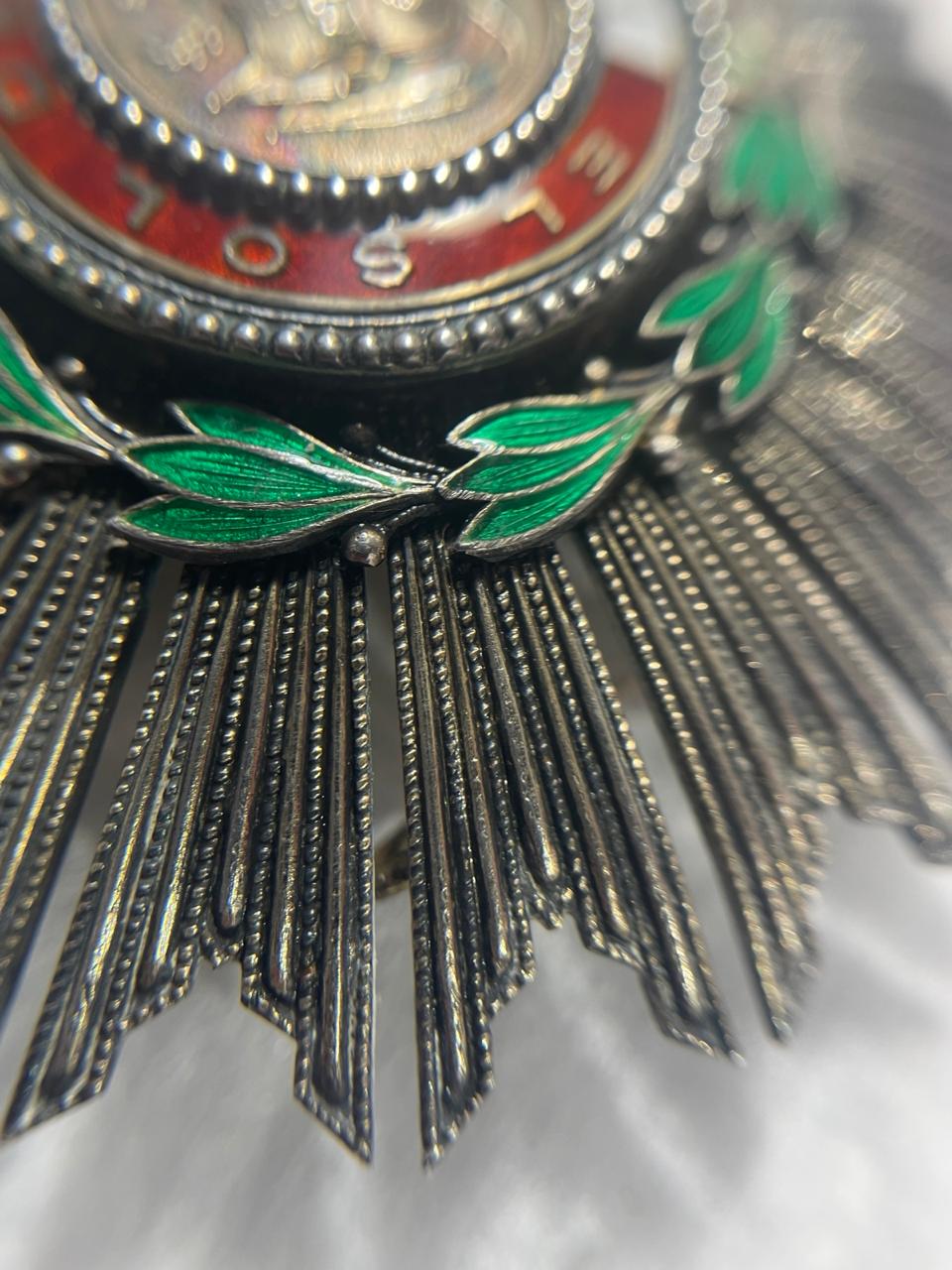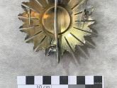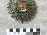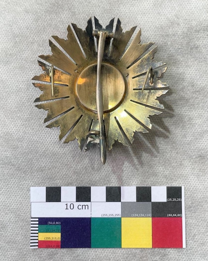 Se realizó un proceso de limpieza mecánica del metal que compone la condecoración, con el objetivo de eliminar los residuos provenientes de productos de limpiametales, aplicados en el pasado. Mediante esta acción de conservación se evita que los residuos del producto continúen ejerciendo una corrosión sobre la pieza.