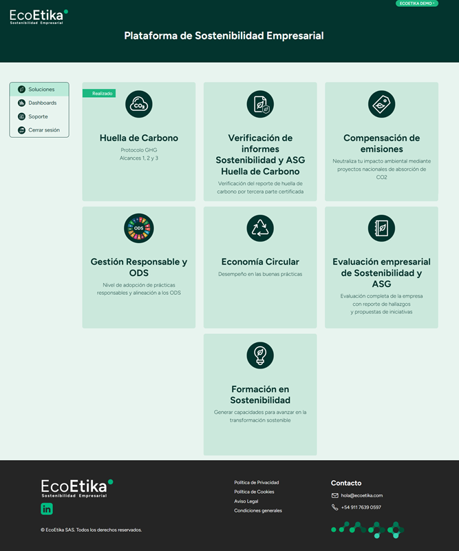Consultoría estratégica en sostenibilidad y criterios ASG para diagnóstico, diseño e implementación de estrategias personalizadas. Soluciones digitales de desarrollo propio que automatiza la gestión, medición y reporte de sostenibilidad, optimiza recursos y convierte datos en información útil para decisiones precisas, potenciado con IA y adaptado a cada organización.