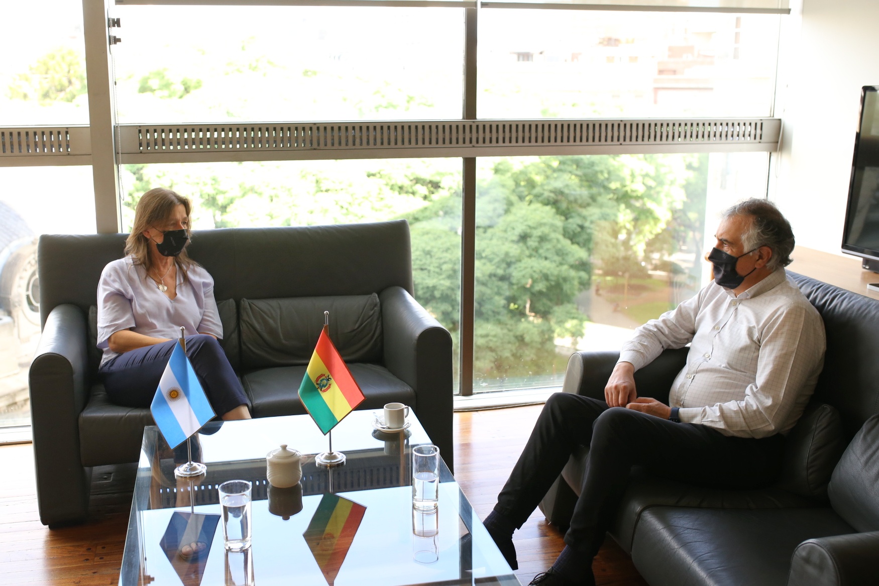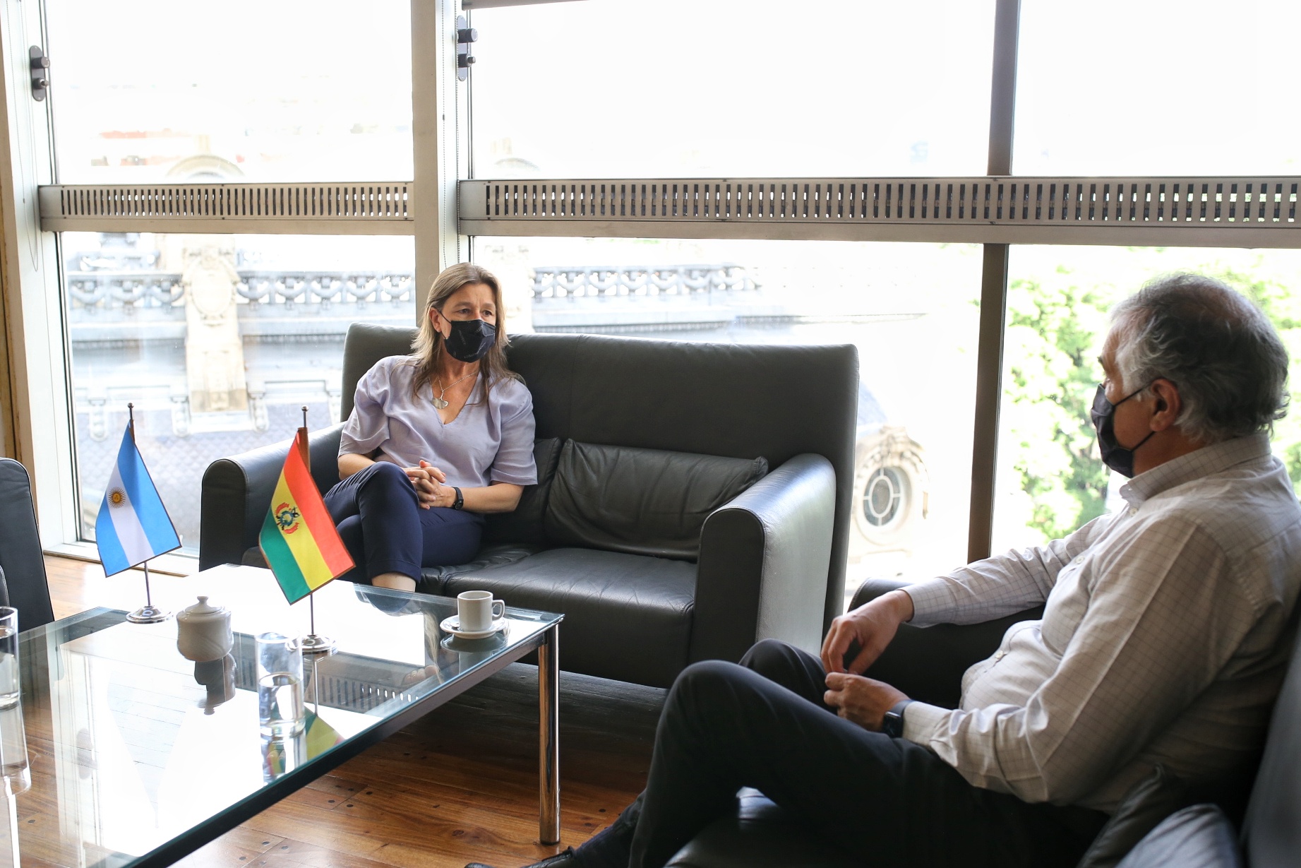 Como parte de la agenda bilateral en la que se realizó la donación de un millón de dosis de vacunas contra el Covid-19 desde Argentina hacia el Estado Plurinacional de Bolivia concretada hace una semana, la Presidenta de Cascos Blancos, Sabina Frederic, y el Embajador de Bolivia en Argentina, Jorge Ramiro Tapia mantuvieron un extenso encuentro en la sede del Ministerio de Relaciones Exteriores, Comercio Internacional y Culto para avanzar en los proyectos comunes sobre los que se conversaron en el país vecino y que son de especial interés del Canciller argentino, Santiago Cafiero.